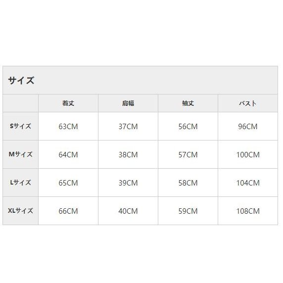 | サイズについての説明 | (サイズ)Sサイズ 着丈63CM 肩幅37CM 袖丈56CM バスト96CM Mサイズ 着丈64CM 肩幅38CM 袖丈57CM バスト100CM Lサイズ 着丈65CM 肩幅39CM 袖丈58CM バスト104CM XLサイズ 着丈66CM 肩幅40CM 袖丈59CM バスト108CM |