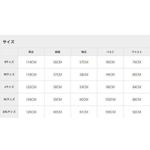 | サイズについての説明 | (サイズ)Sサイズ 着丈114CM 肩幅36CM 袖丈57CM バスト90CM ウエスト76CM Mサイズ 着丈118CM 肩幅37CM 袖丈58CM バスト94CM ウエスト80CM Lサイズ 着丈122CM 肩幅38CM 袖丈59CM バスト98CM ウエスト84CM XLサイズ 着丈124CM 肩幅39CM 袖丈60CM バスト102CM ウエスト88CM 2XLサイズ 着丈126CM 肩幅40CM 袖丈61CM バスト106CM ウエスト92CM |