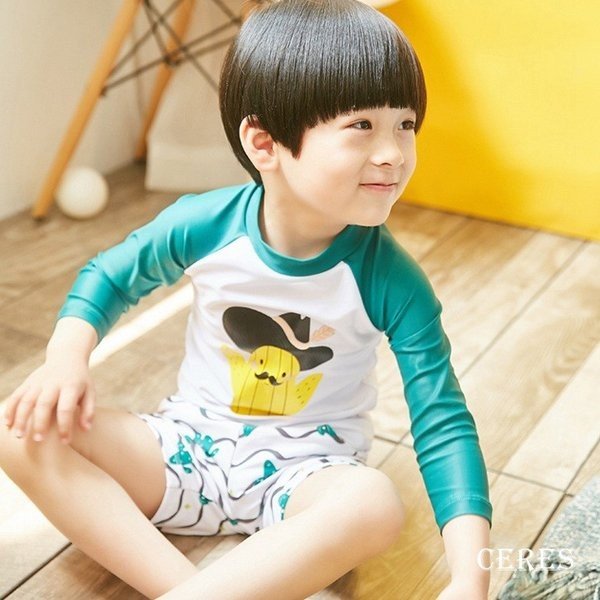 子供水着 男 キャップ付き 上下セット スイムスーツ UV対策 長袖 100 110 120 130 140