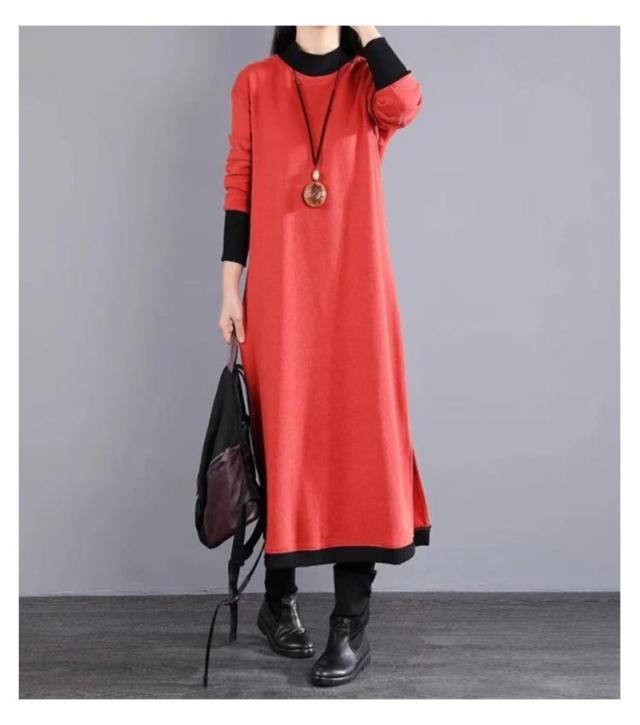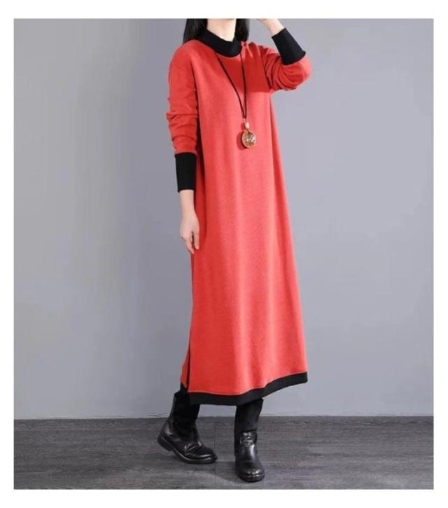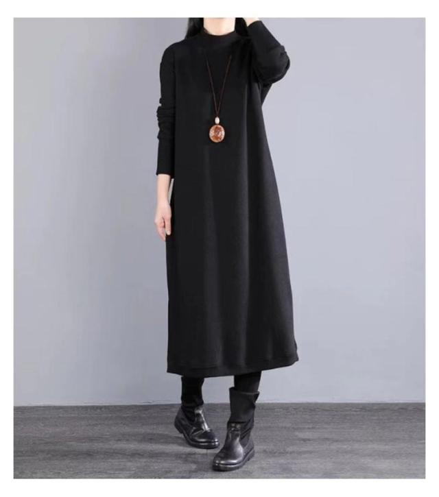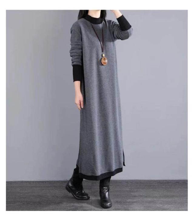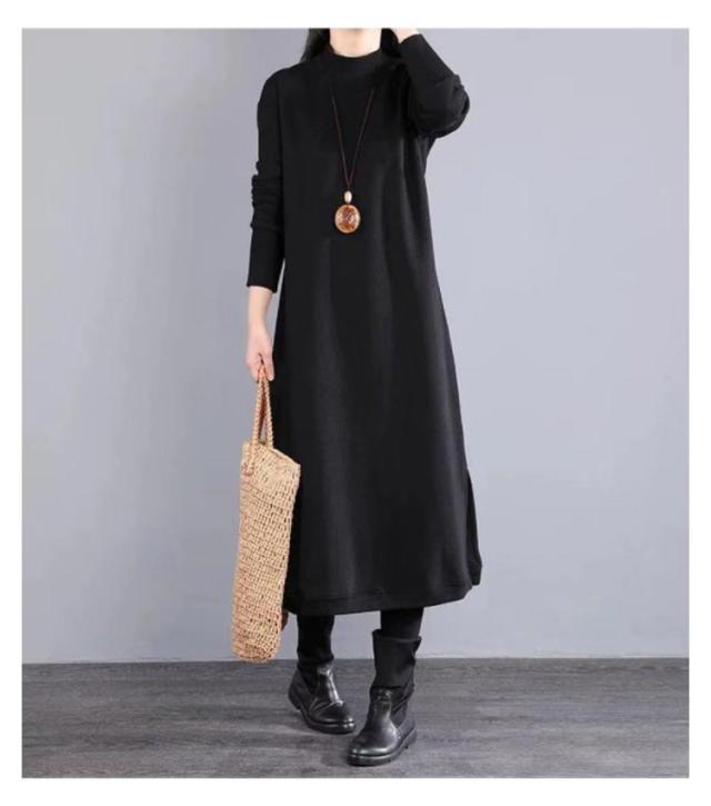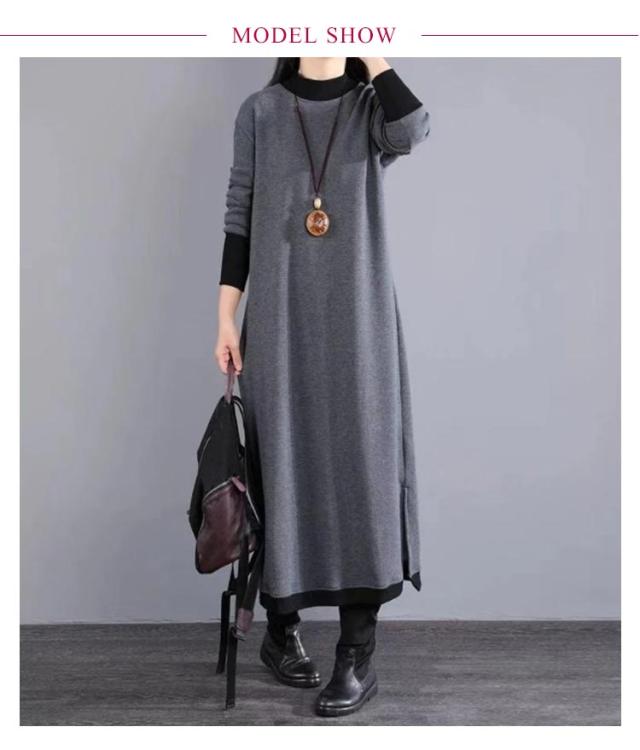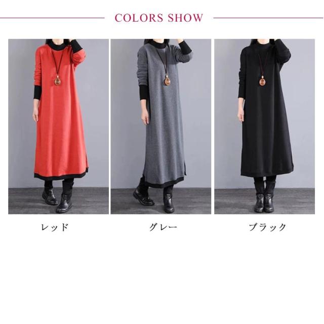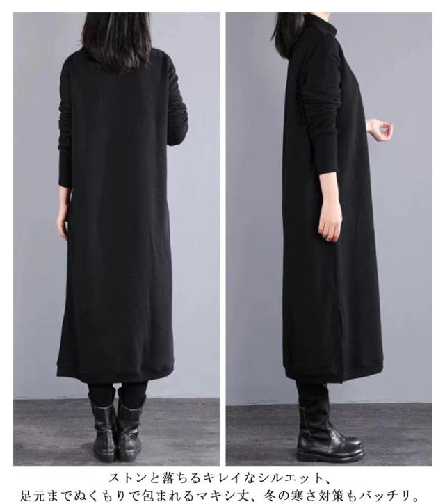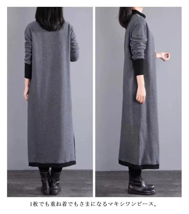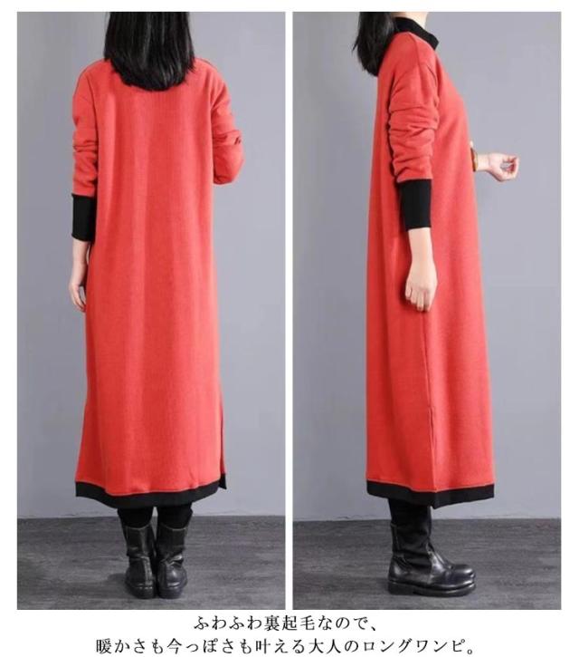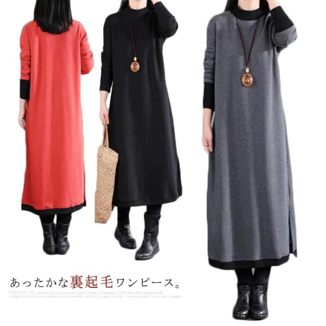 マキシワンピース 裏起毛 長袖 ワンピース レディース スリット入り ロング丈 ワンピ 体型カバー 厚手 秋 冬服 ラウンドネック