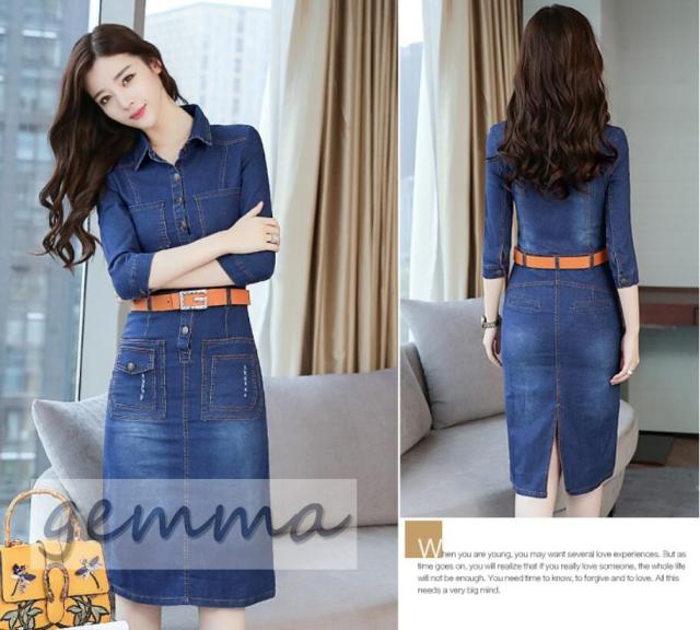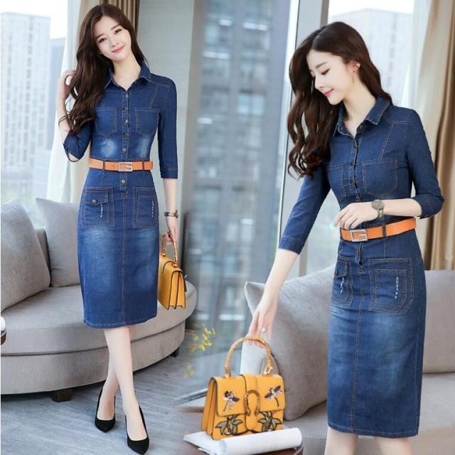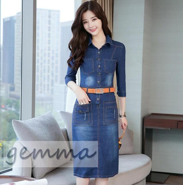 デニムワンピース レディース タイトワンピース 膝丈 Aライン 七分袖 いいスタイル 上品 エレガント 大きいサイズ カジュアル デニムワンピース 2018春新作