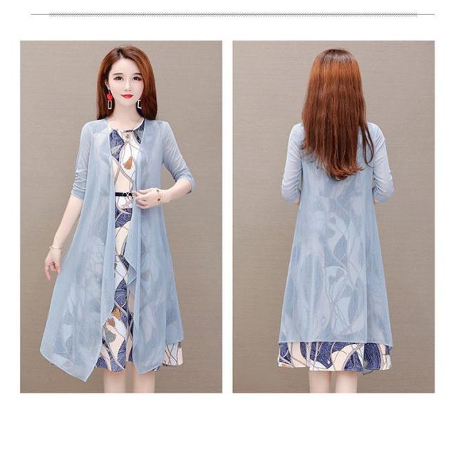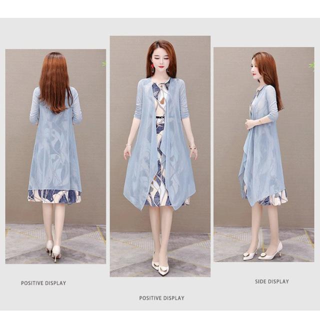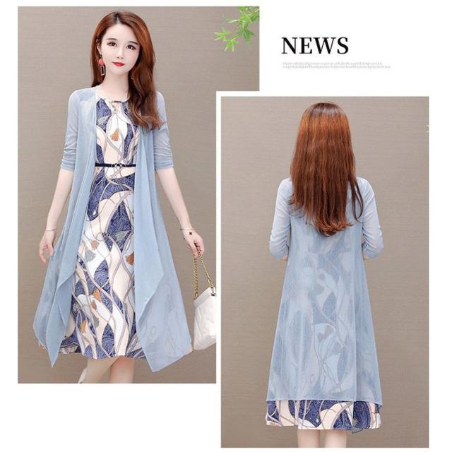 ワンピース2点セット レディース 春夏 膝丈ワンピース 幾何プリント 五分袖ロング丈ガウン UVカット オシャレセットアップ 大人 上品 着痩せ 40代 紫外線カット