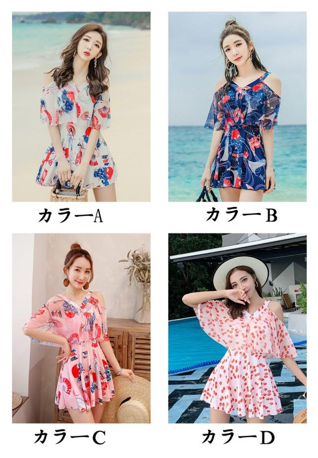 水着 ワンピース レディース 体型カバー 大きいサイズ 水着 オールインワン 3L 4L ママ 水着 オフショルダー フレア 花柄 温泉 大きいサイズ