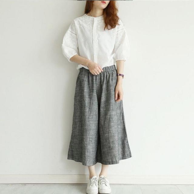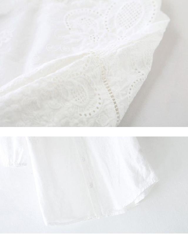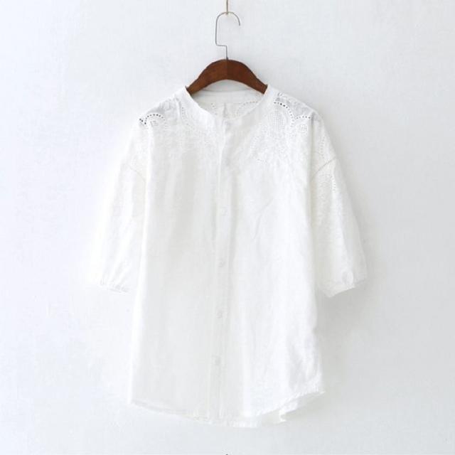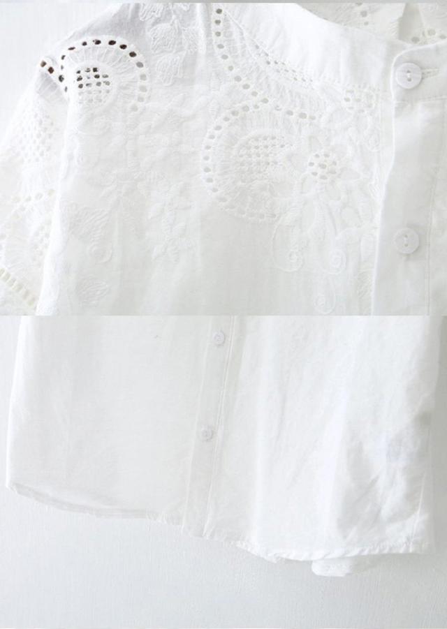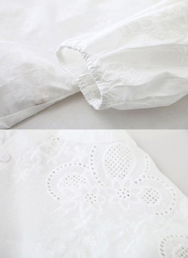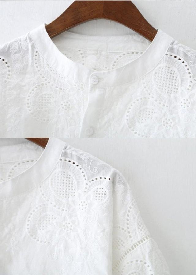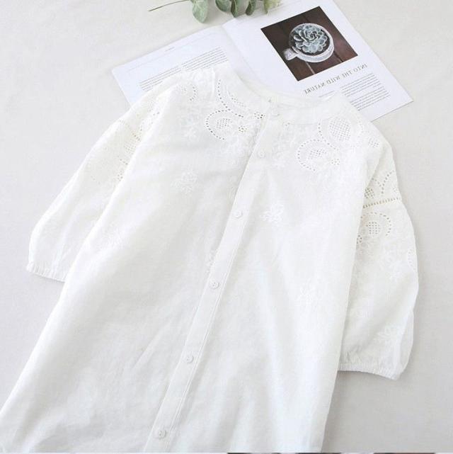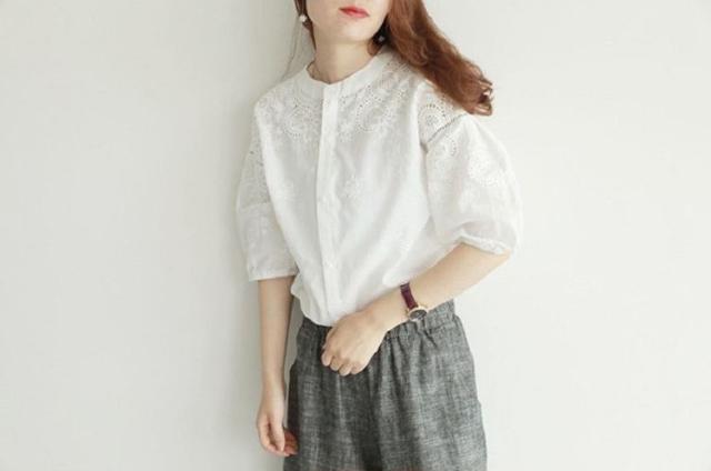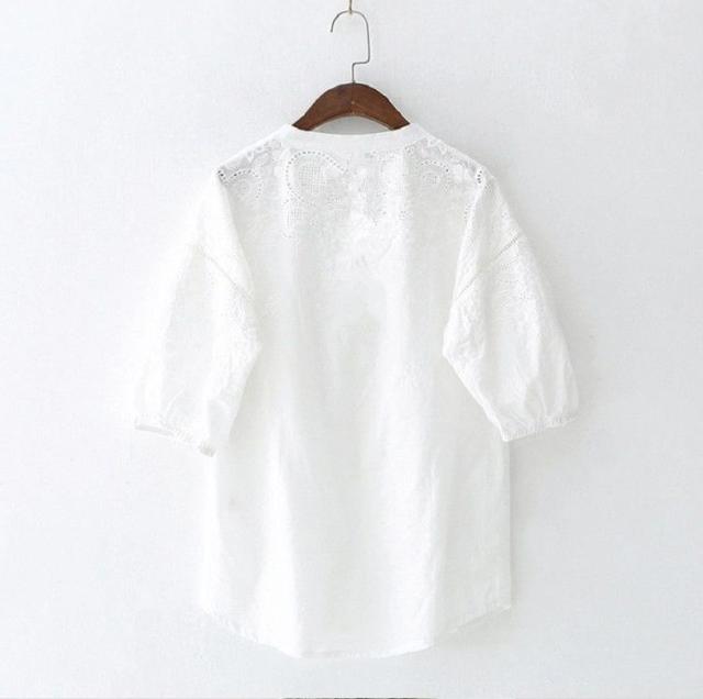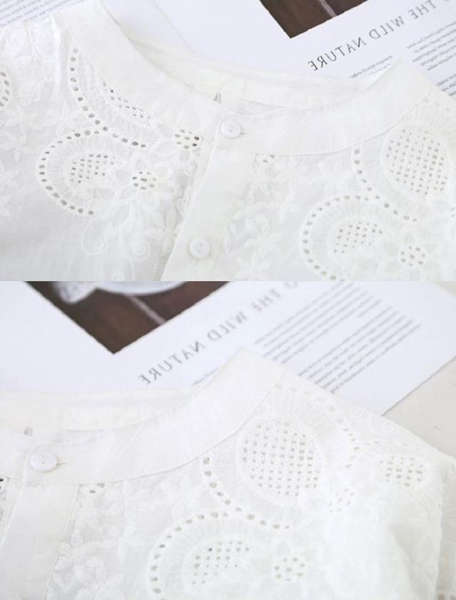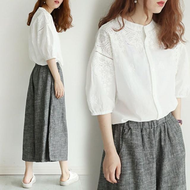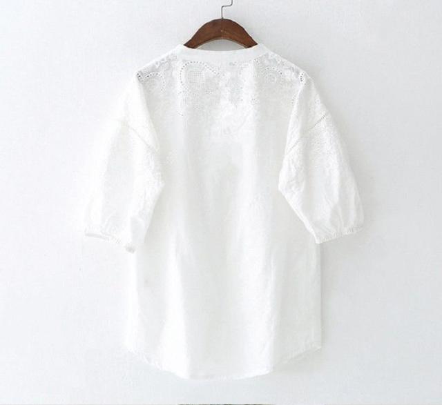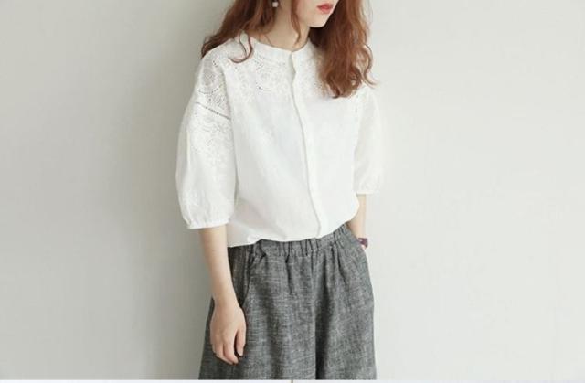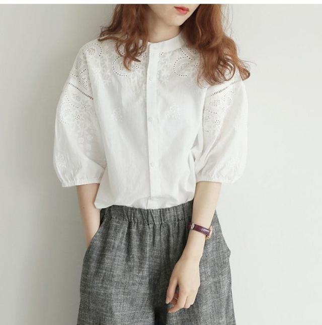 ブラウス レディース 40代 春夏 オシャレブラウス 韓国風 五分袖チュニック 白レース刺繍 パフスリーブシャツ 白トップス ゆったり 体型カバー カジュアル