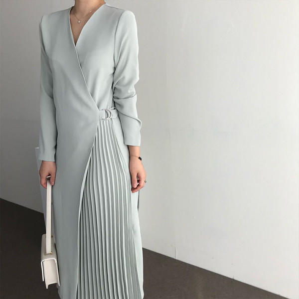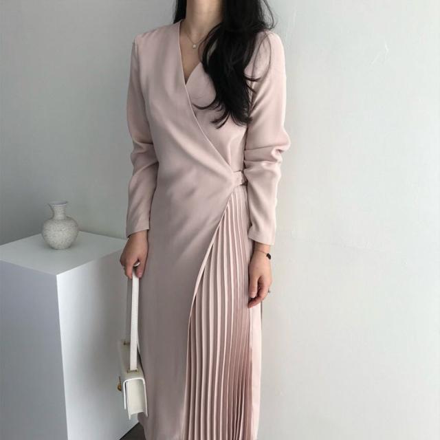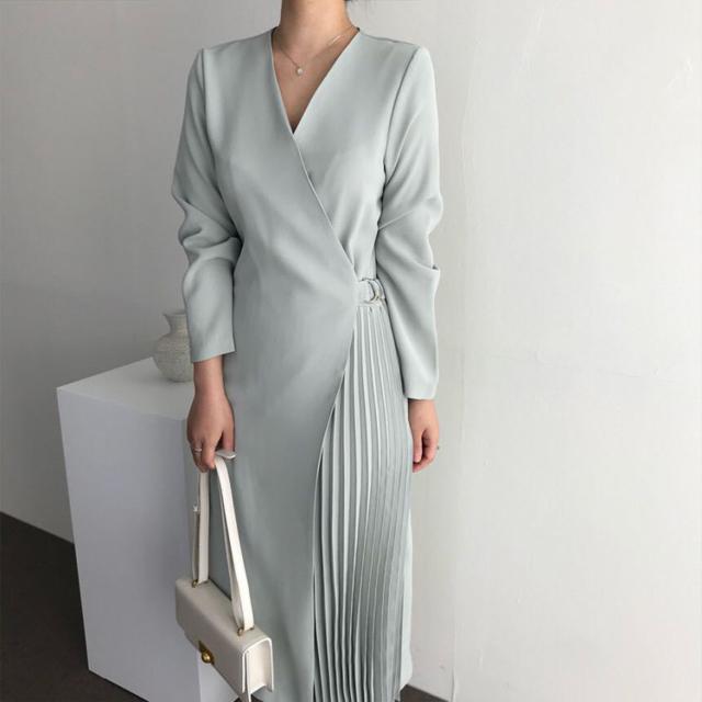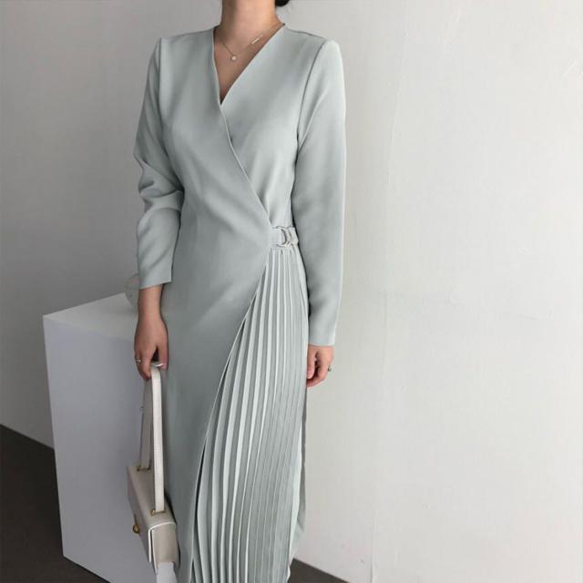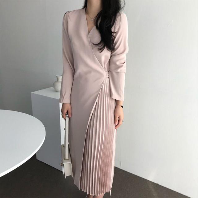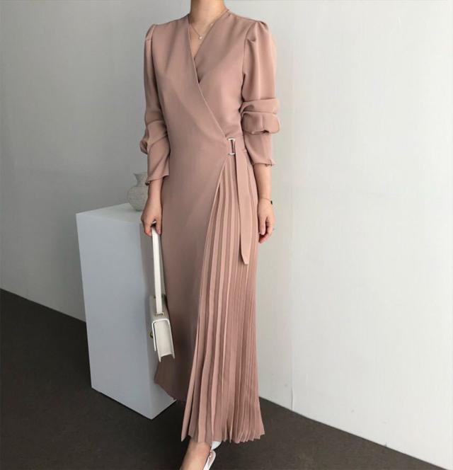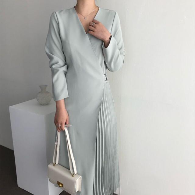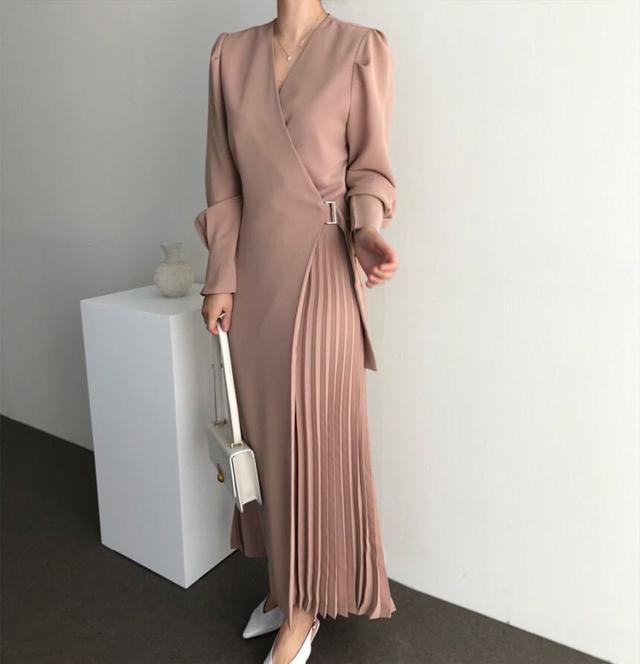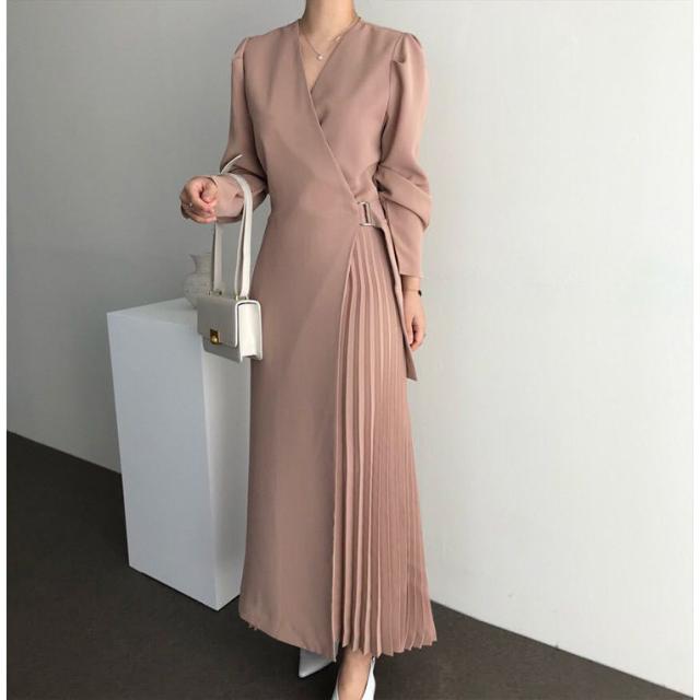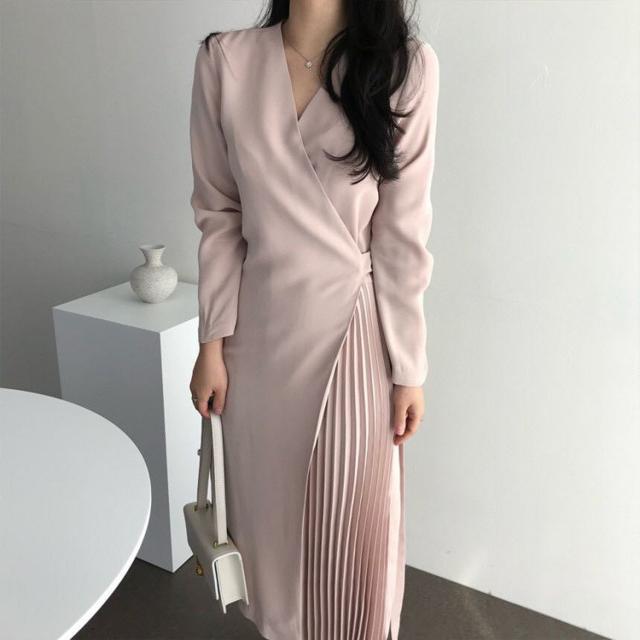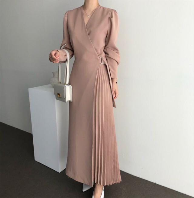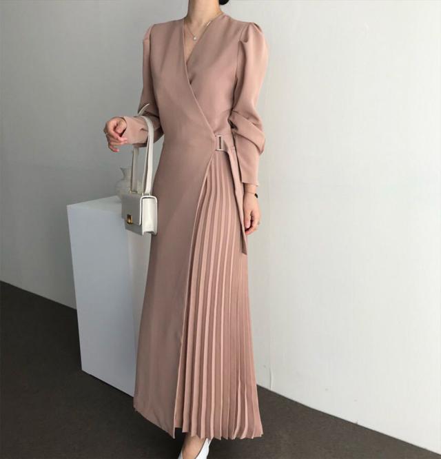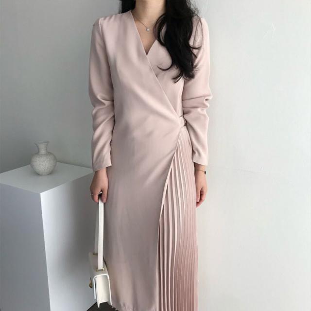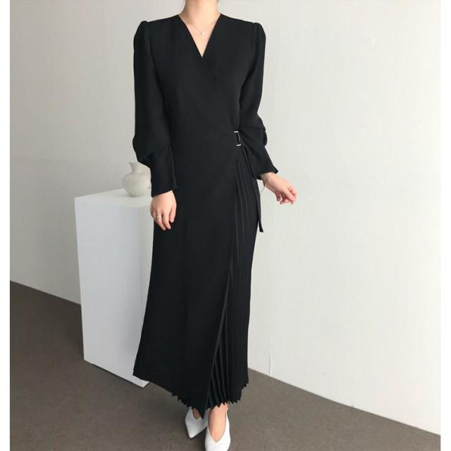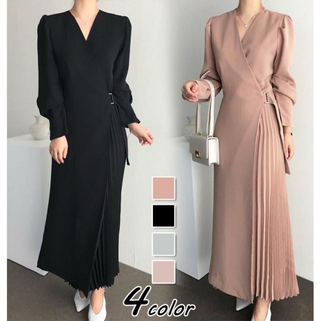 シャツワンピース レディース 40代 キレイめ マキシワンピース 秋冬 長袖ワンピース 無地 Vネック プリーツスカート オシャレ韓国風 体型カバー30代 50代