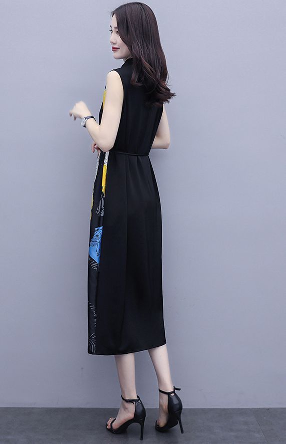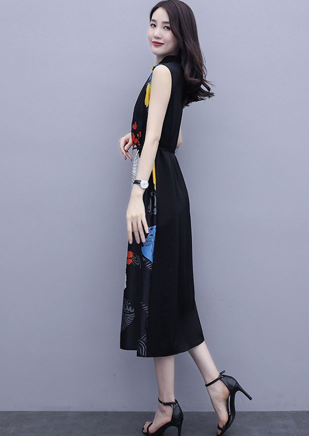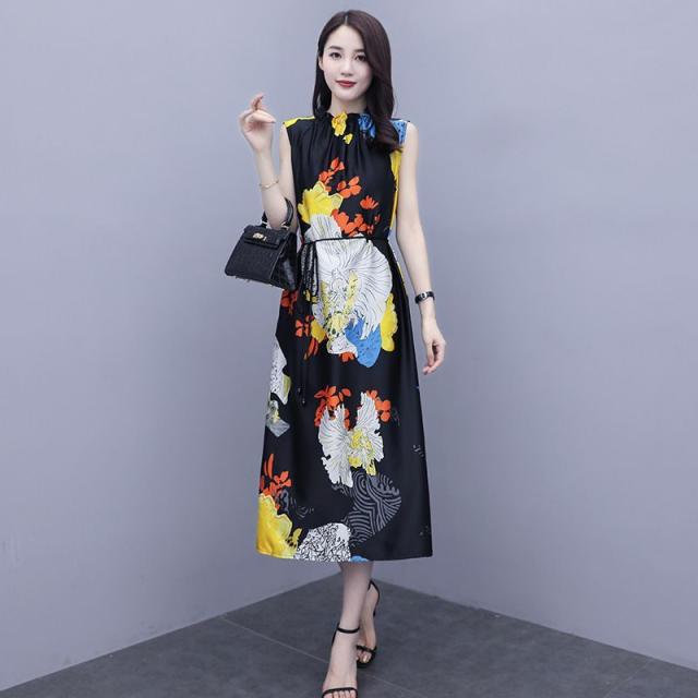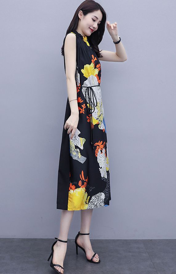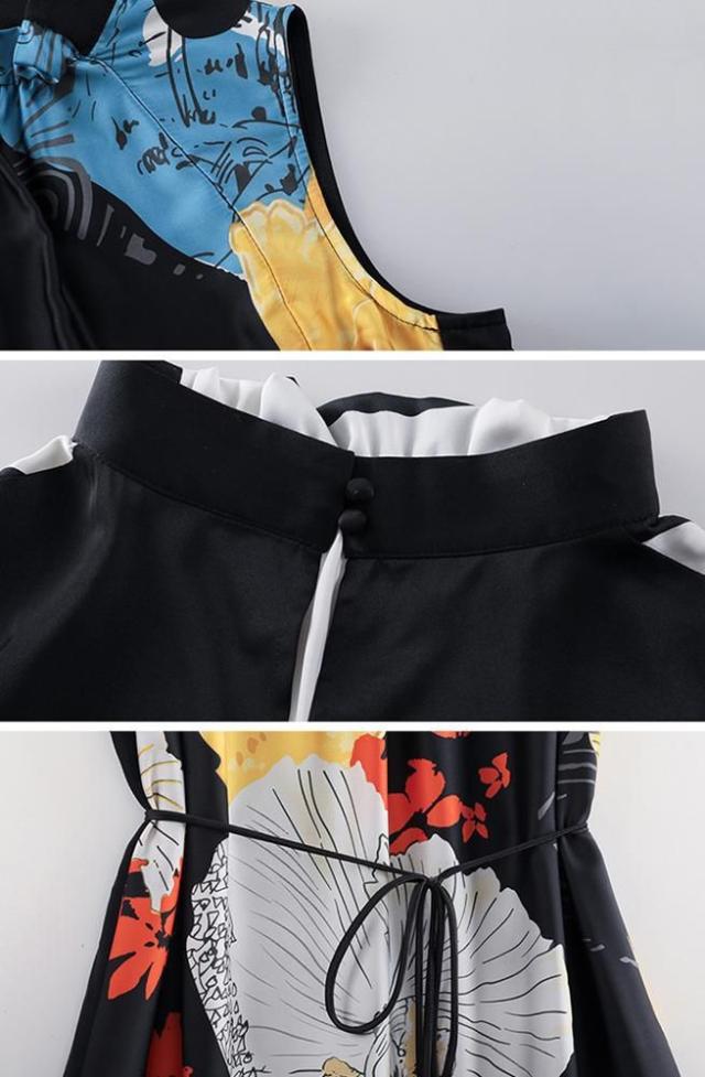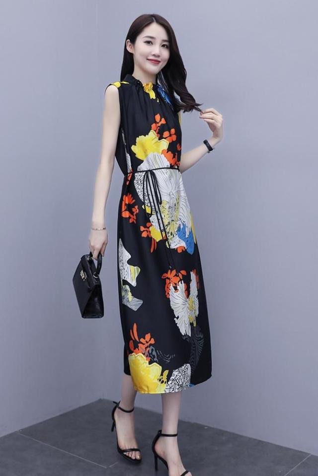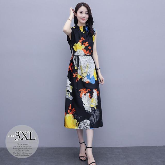 ワンピース プリント柄 ノースリーブ ウエスト紐 大人可愛い 学校行事 ママスタイル リゾート カジュアル 母親 休日 フェミニン