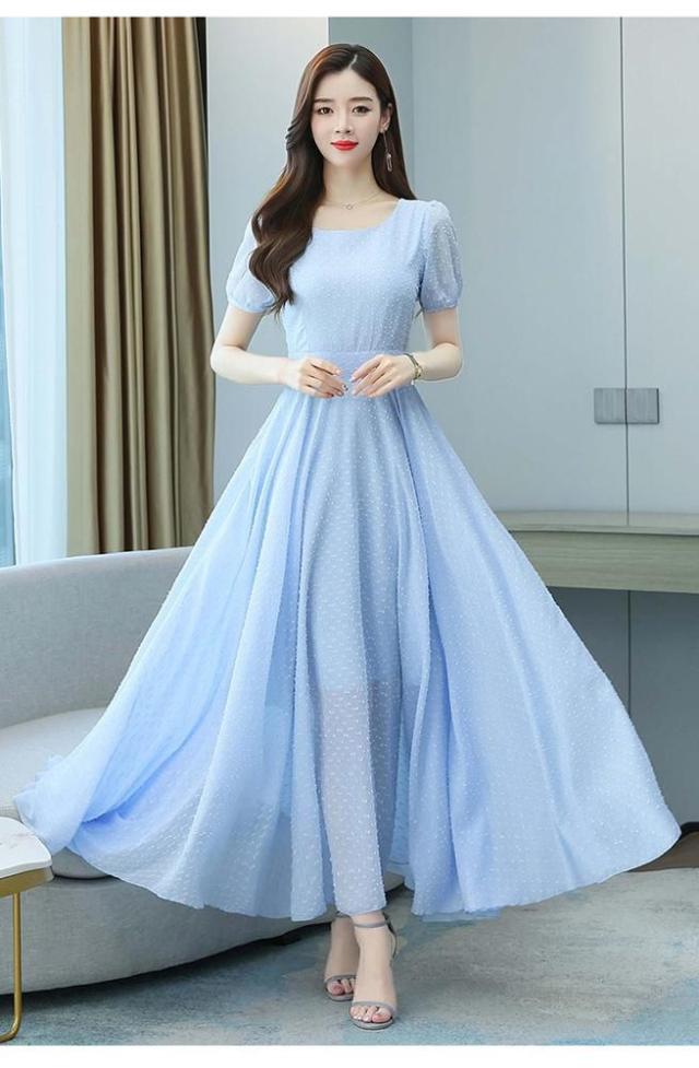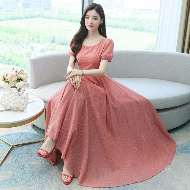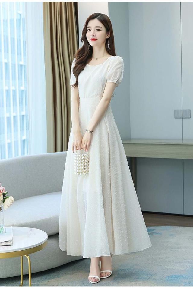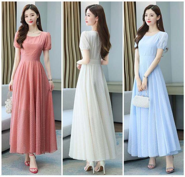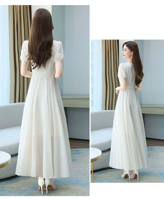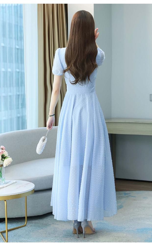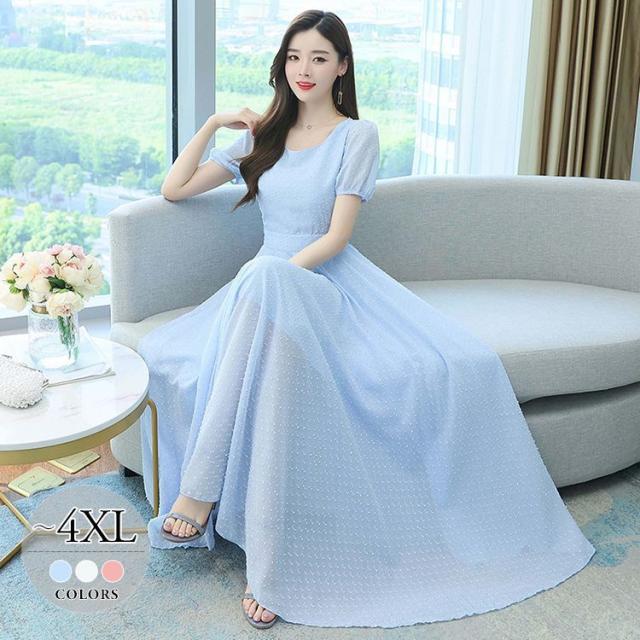 ワンピース ラウンドネック パフスリーブ ウエストマーク ハイウエスト ロング丈ワンピ クラシカル 甘め ガーリー ママスタイル 女子旅 清楚