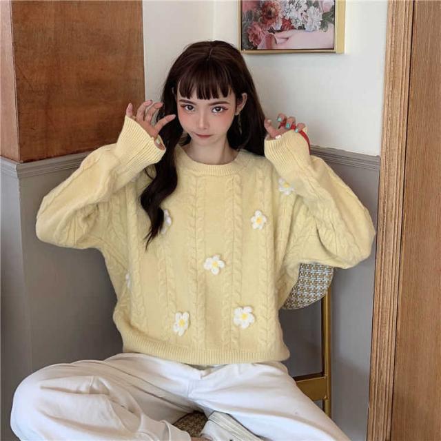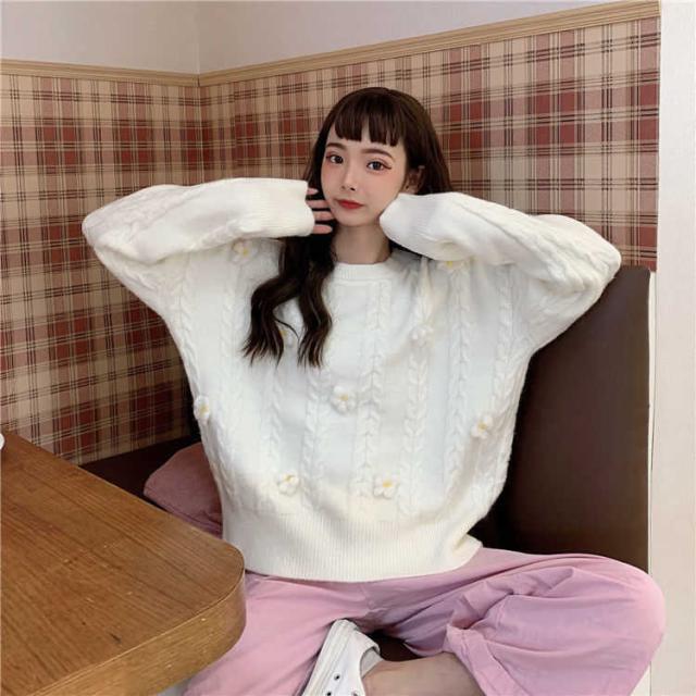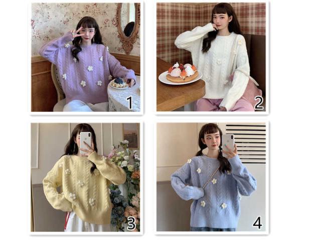 ニット セーター プルオーバー 編み込み レディース ツイストセーター ルーズ アウターウェア ラウンドネック かわいい 優しい 長袖 立体小花 ブルー パープル イエロー ホワイト