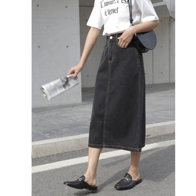 デニムスカート ロング丈 レディース スカート ストレッチ ブックスリット 体型カバー ブラック 夏 春 秋 普段着 着やすい 美しいボディライン