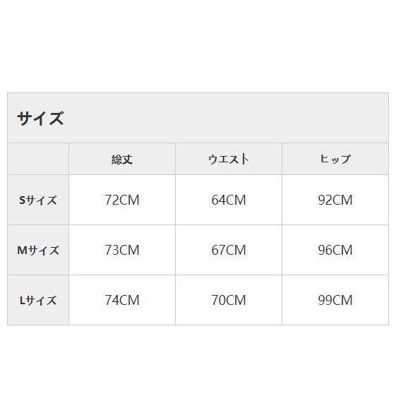 | サイズについての説明 | 【サイズ】Sサイズ 総丈72CM ウエスト64CM ヒップ92CM Mサイズ 総丈73CM ウエスト67CM ヒップ96CM Lサイズ 総丈74CM ウエスト70CM ヒップ99CM |