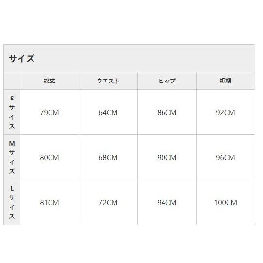 | サイズについての説明 | 【サイズ】Sサイズ 総丈79CM ウエスト64CM ヒップ86CM 裾幅92CM Mサイズ 総丈80CM ウエスト68CM ヒップ90CM 裾幅96CM Lサイズ 総丈81CM ウエスト72CM ヒップ94CM 裾幅100CM |