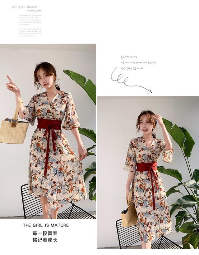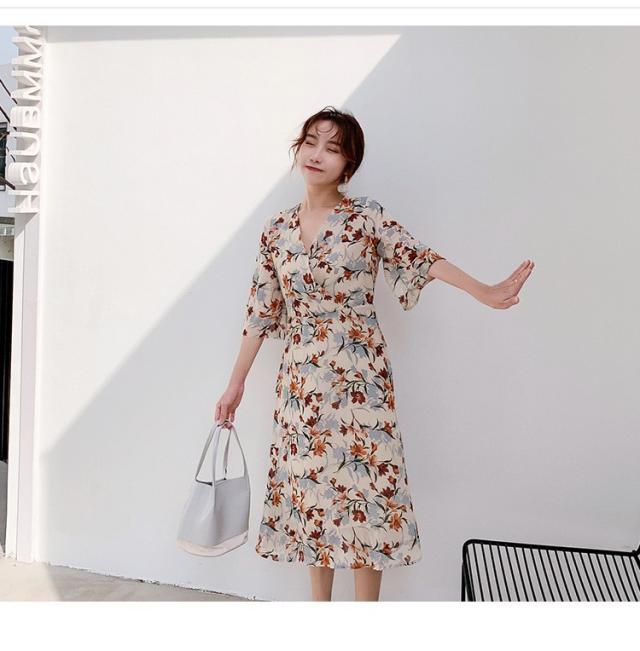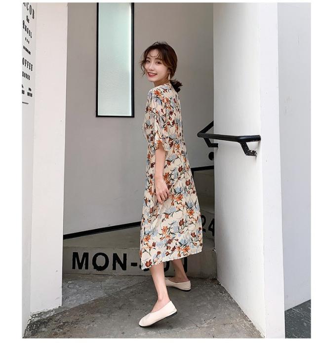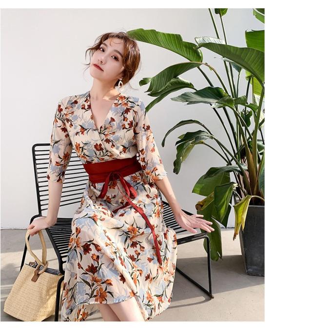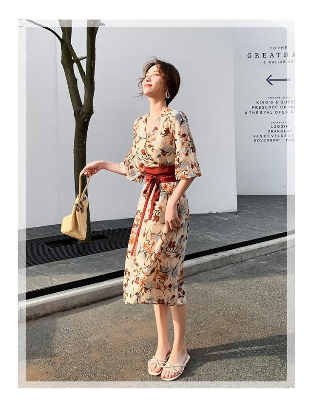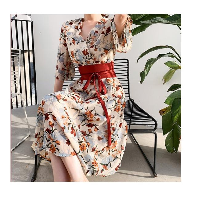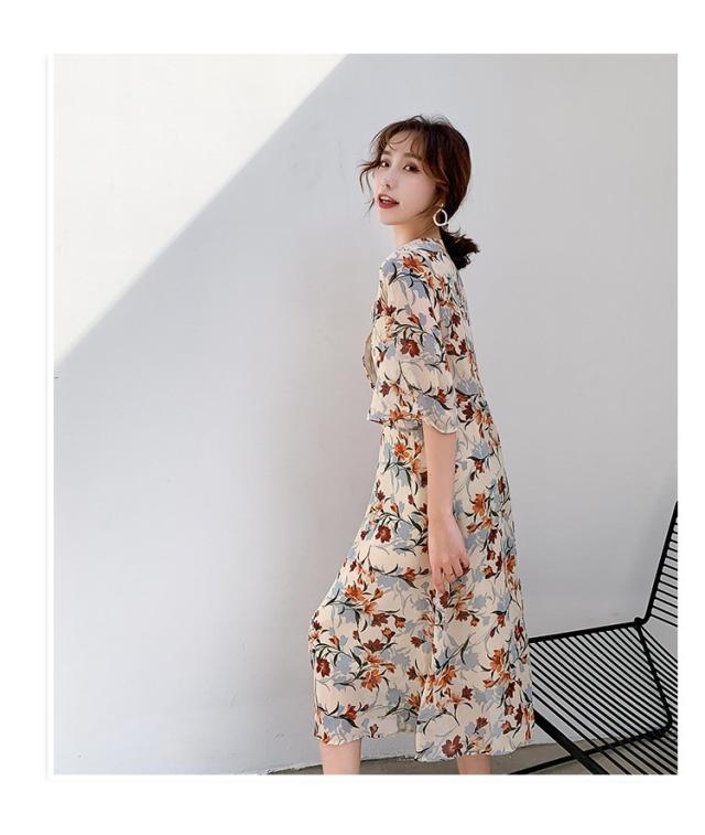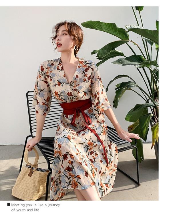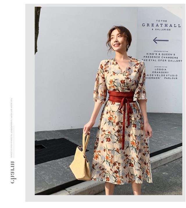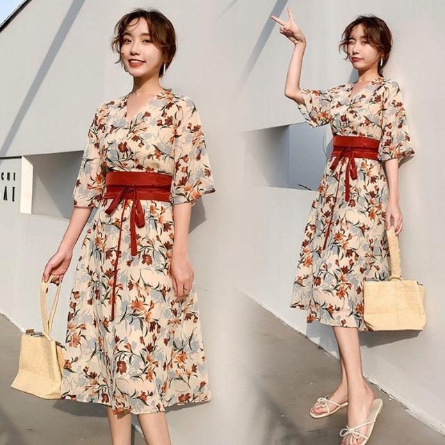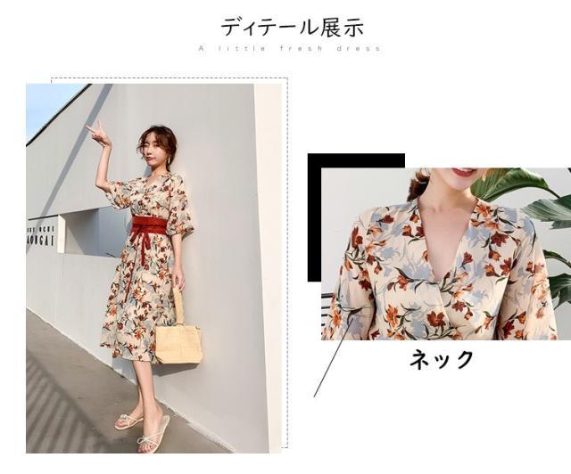 ワンピース レディース 40代 マキシワンピース 春夏 きれいめ シフォンワンピース 五分袖 Vネックワンピース 花柄スカート オシャレ 結婚式 お出かけ
