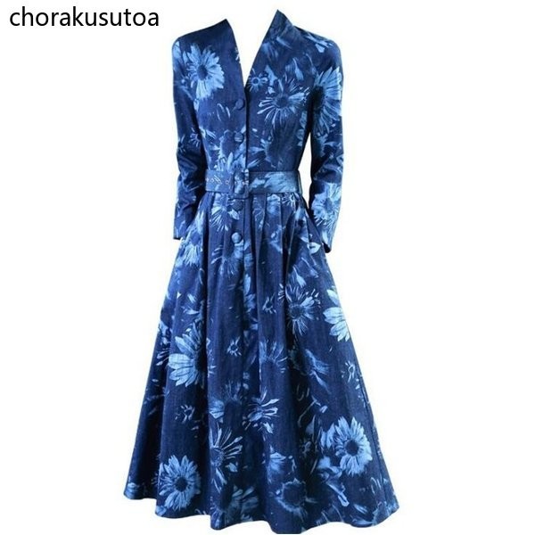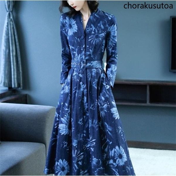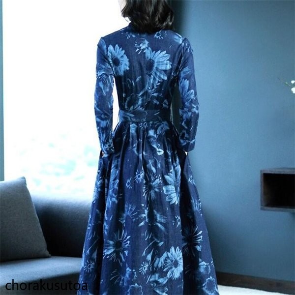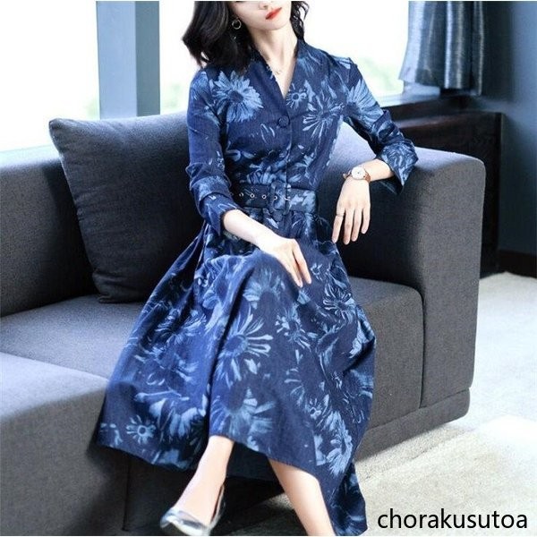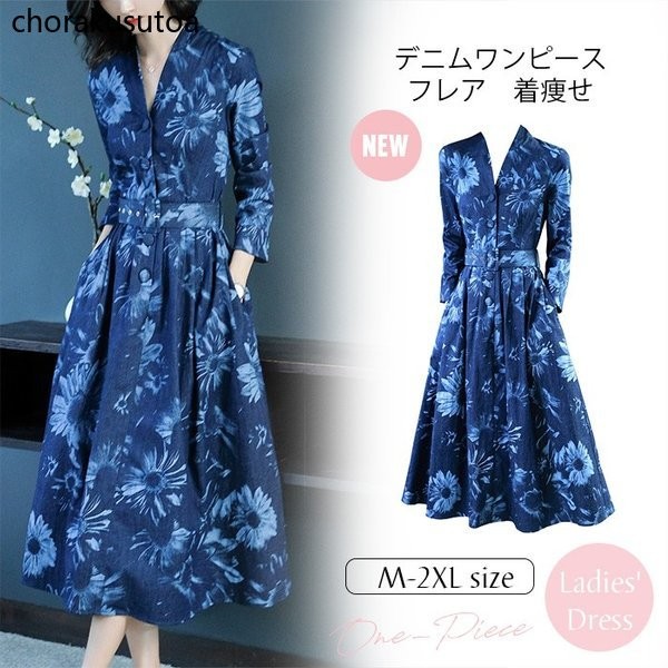 ワンピース レディース きれいめ ロングワンピース 秋 フォーマル 結婚式 ワンピース 花柄 Vネック デニムワンピース 大きいサイズ パーティー 二次会