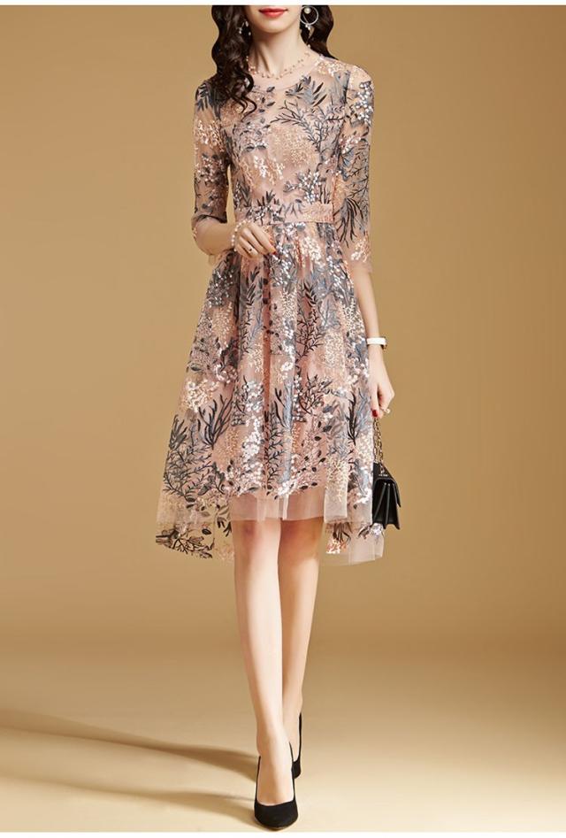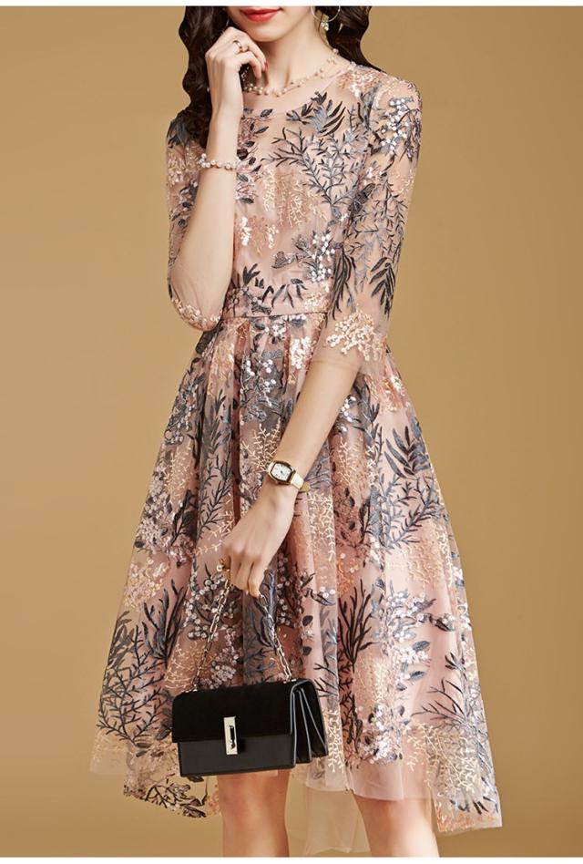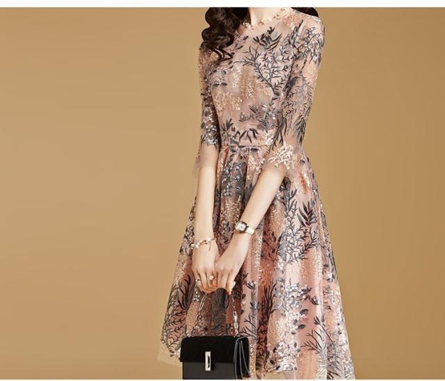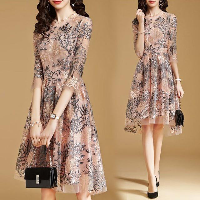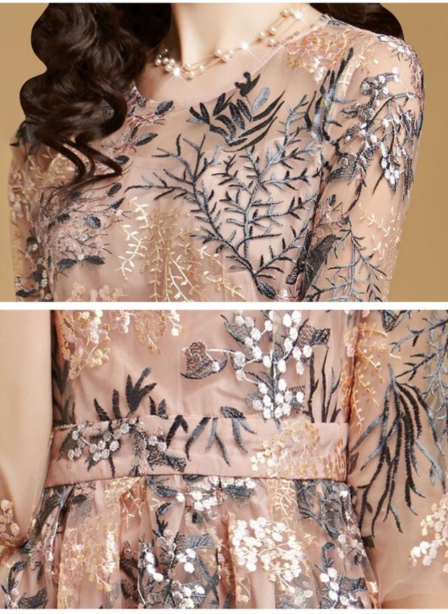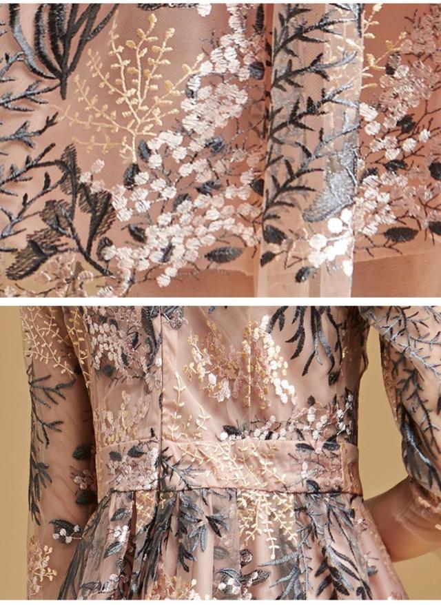 ワンピースドレス レディース 40代 秋服 きれいめ 膝丈ワンピース 七分袖 花柄 レース刺繍ワンピース Aライン ロング丈 結婚式ドレス パーティー オシャレ
