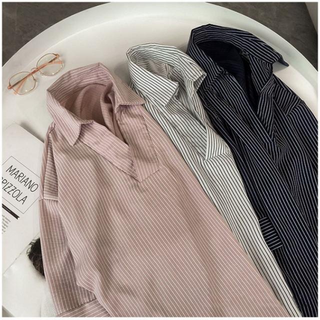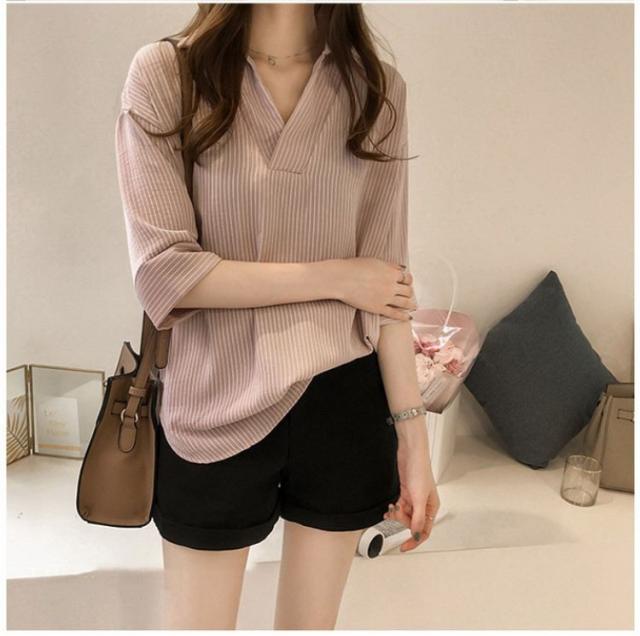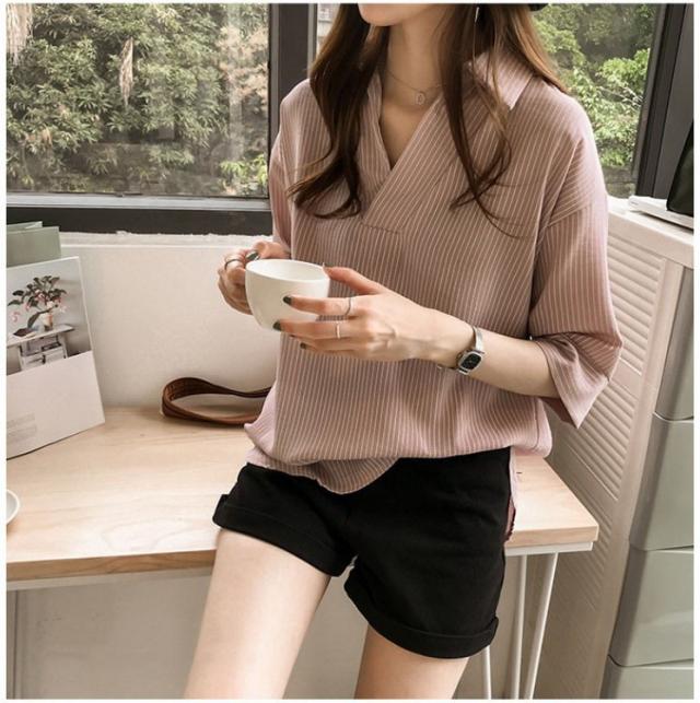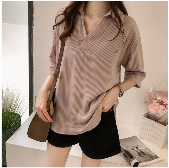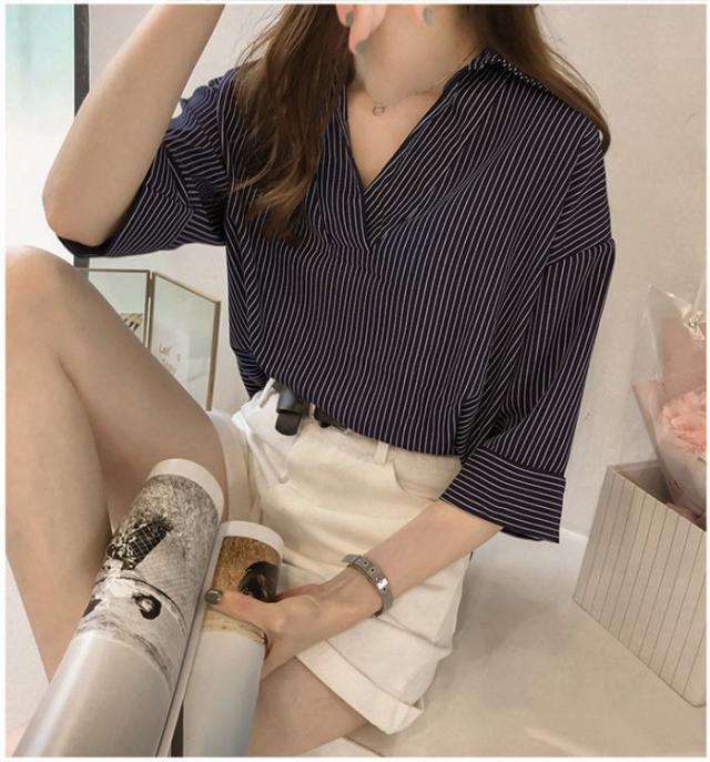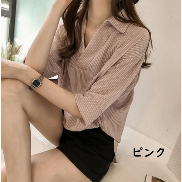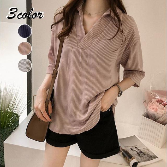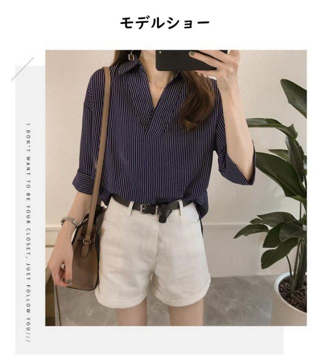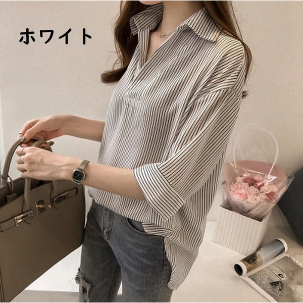 ブラウス レディース 40代 春夏 上品 七分袖ブラウス きれいめ白シャツ vネック ストライプ柄シフォンブラウス 薄手 韓国風 通勤 大人 Tシャツ 30代 50代 3色
