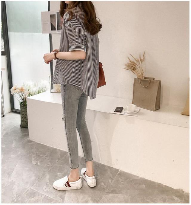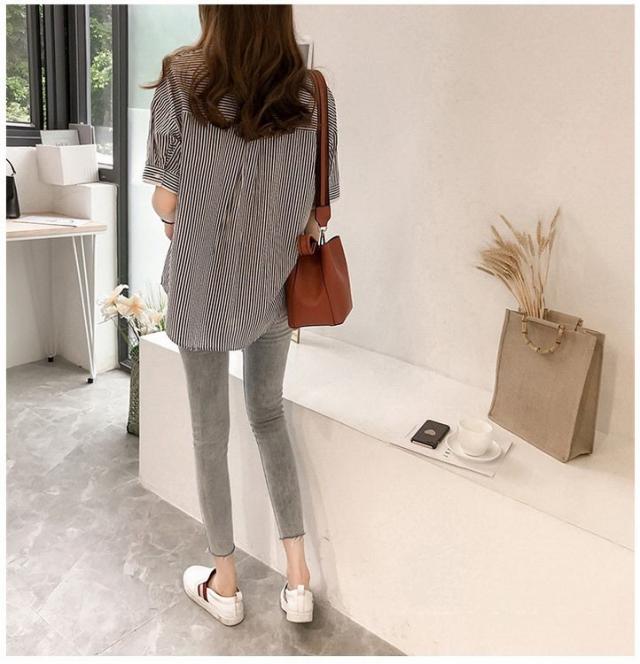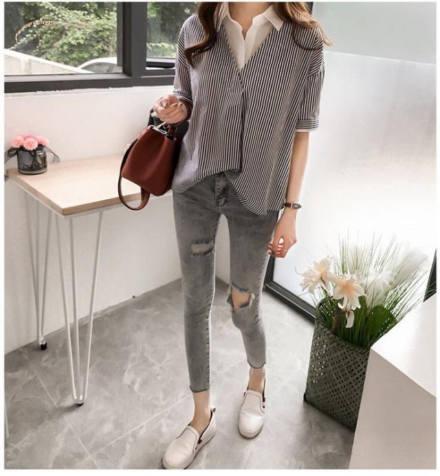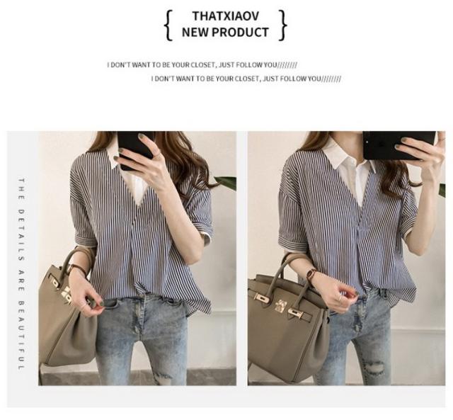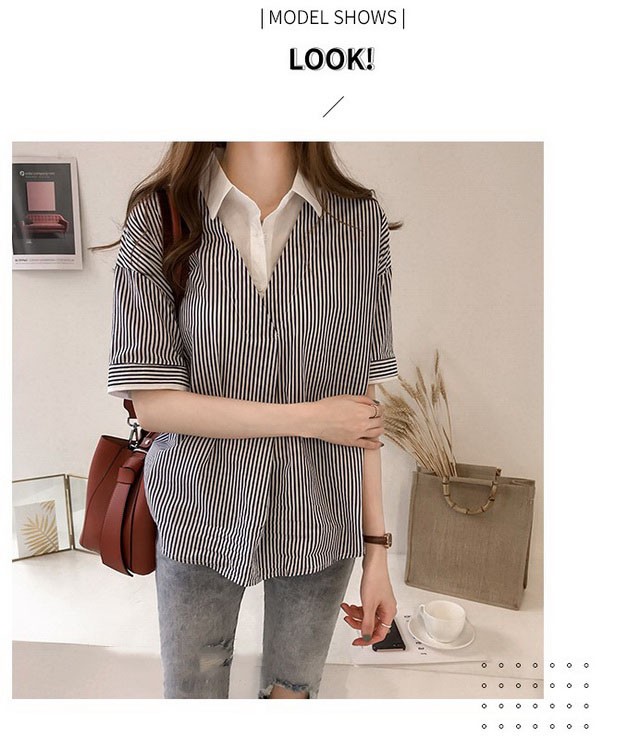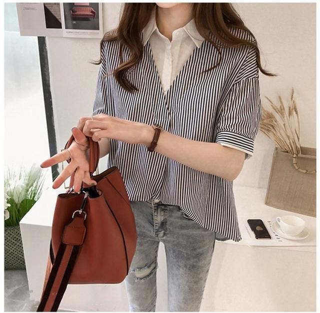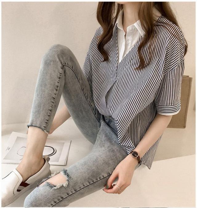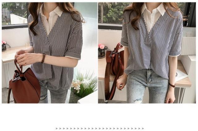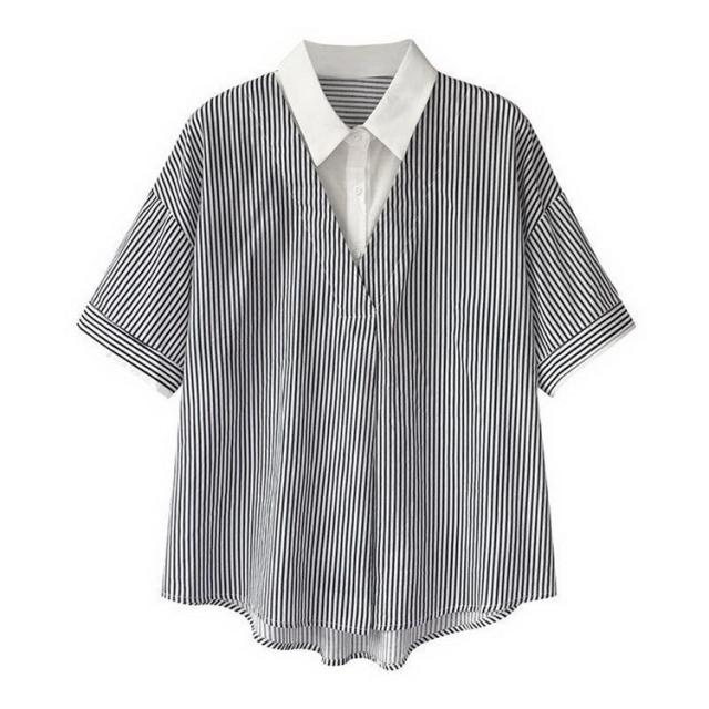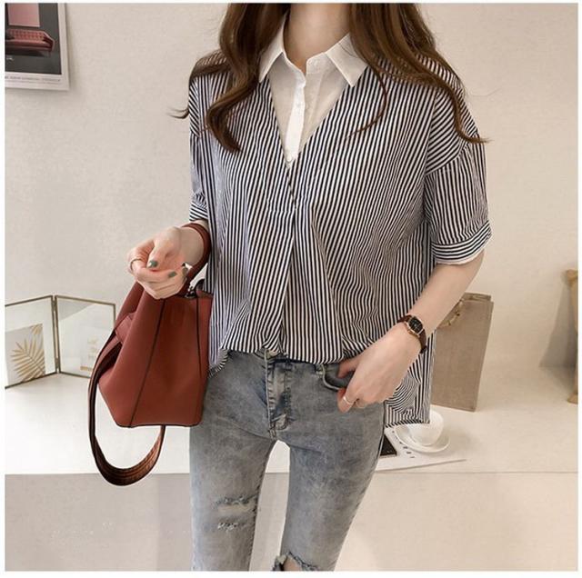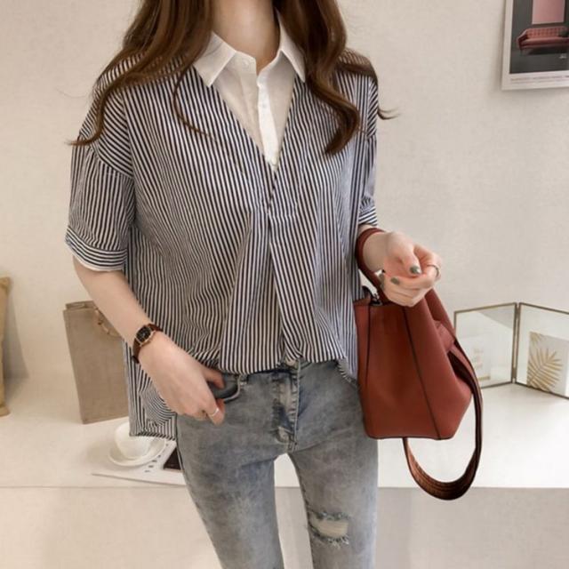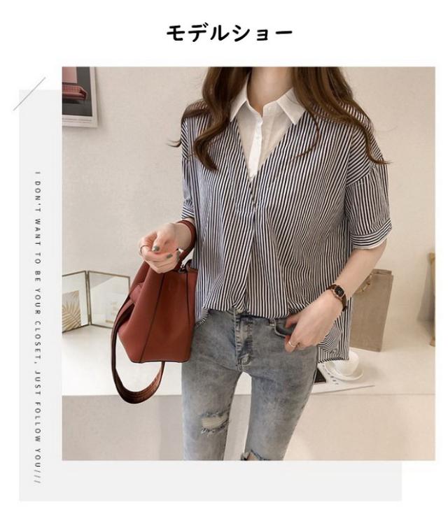 ブラウス レディース 40代 きれいめ 春夏 上品 半袖ブラウス vネック ストライプ柄シフォンブラウス フェイクレイヤード 薄手 韓国風 通勤 大人 Tシャツ