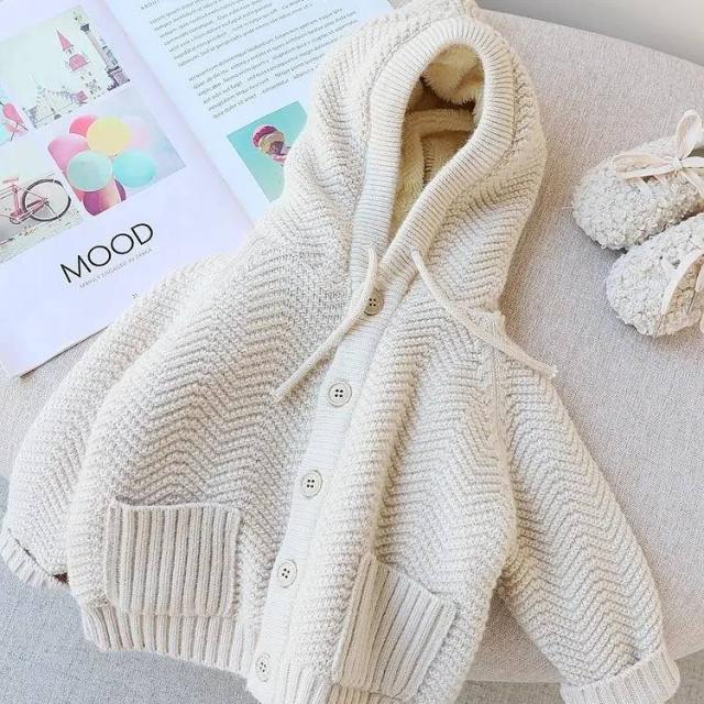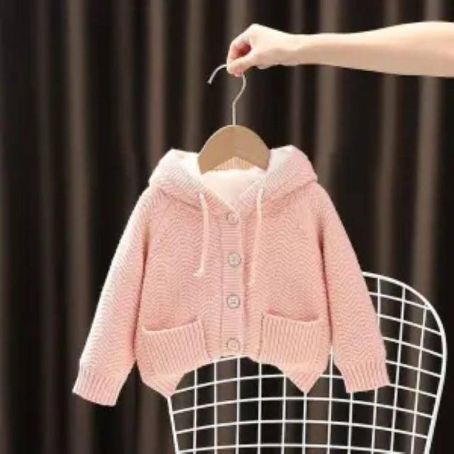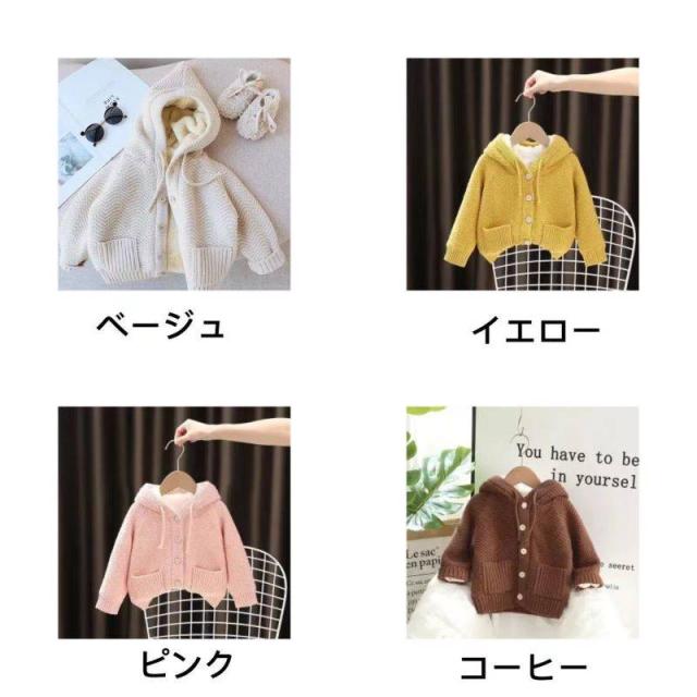 ニットパーカー キッズ ニットトップス パーカー コート 前開き カーディガン アウター 羽織り 長袖 ニットケーブル編み フード ボタン 90-140cm 裏起毛 ベージュ ブラウン ピンク イエロー