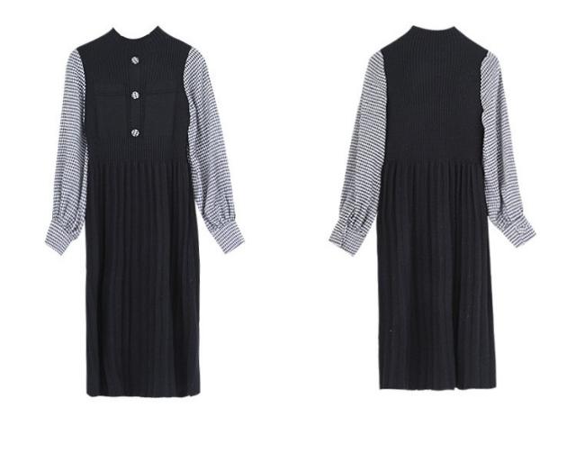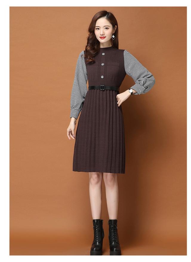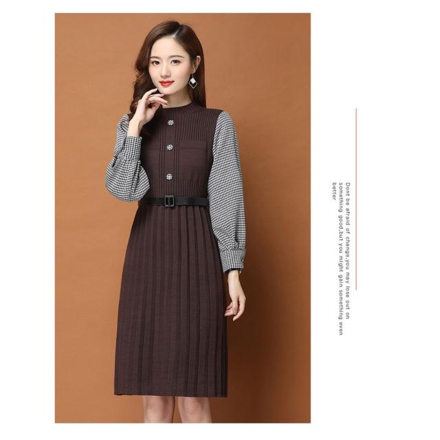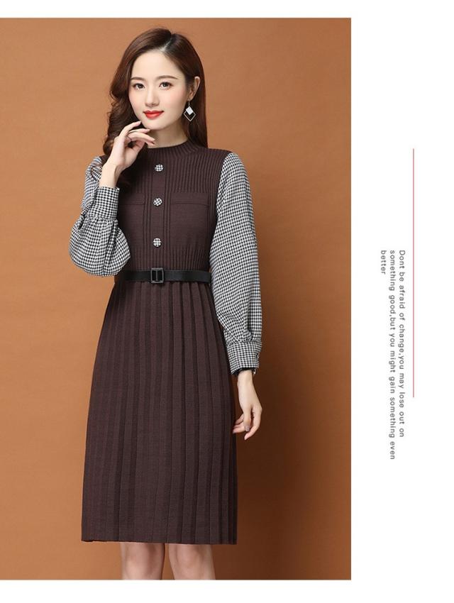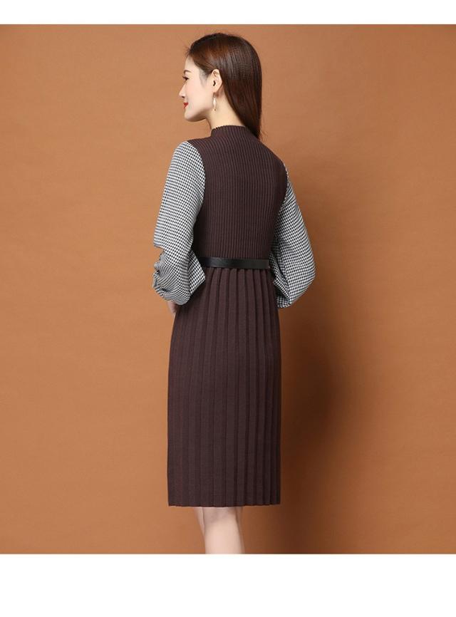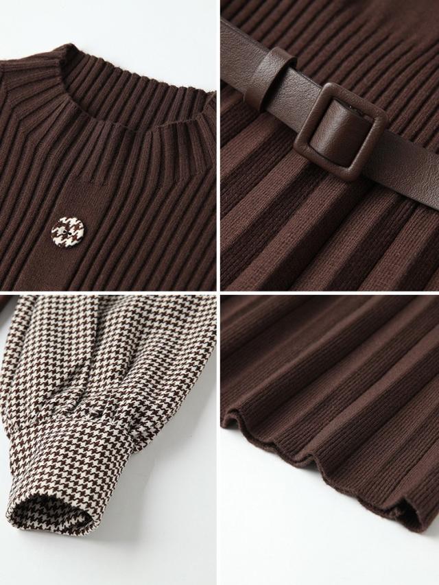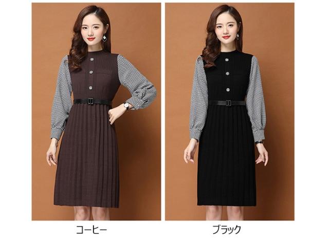 ニットワンピース レディース 40代 秋冬 きれいめ 膝丈ワンピース 長袖 チェック柄 切り替え プリーツスカート ニットワンピース結婚式ドレス 着痩せ オシャレ