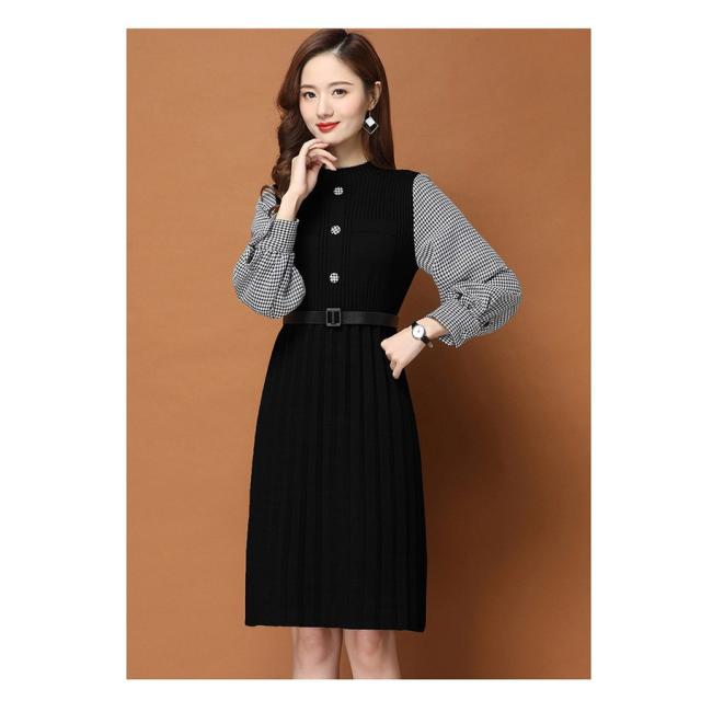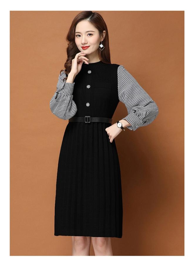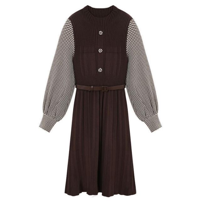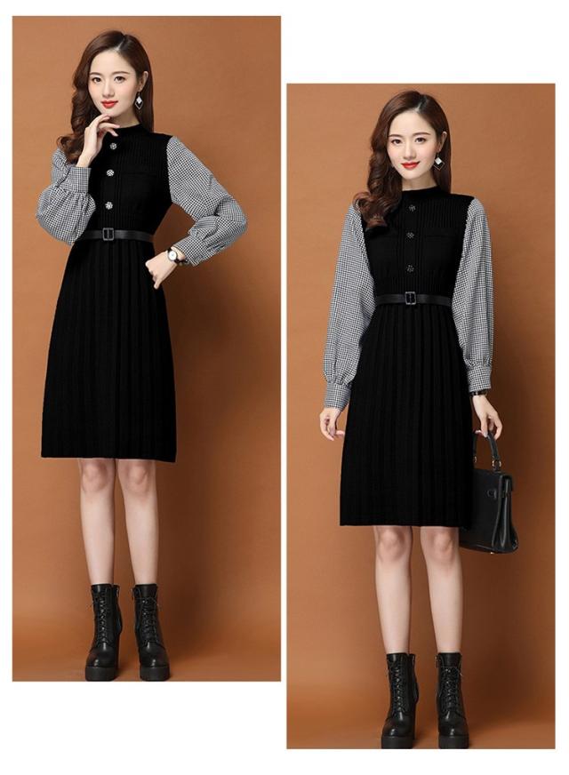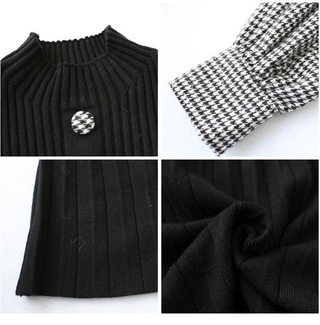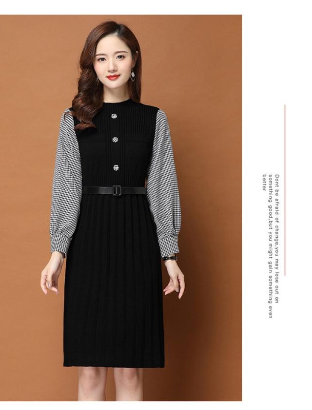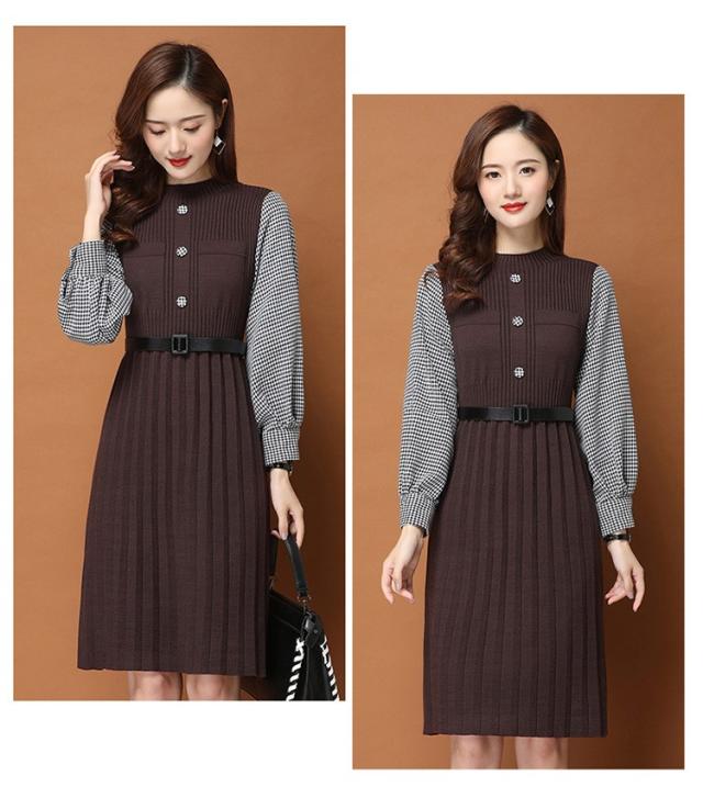 ニットワンピース レディース 40代 秋冬 きれいめ 膝丈ワンピース 長袖 チェック柄 切り替え プリーツスカート ニットワンピース結婚式ドレス 着痩せ オシャレ