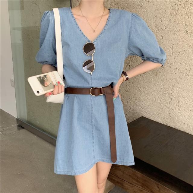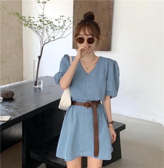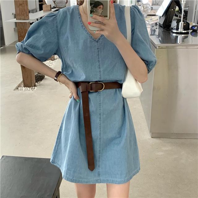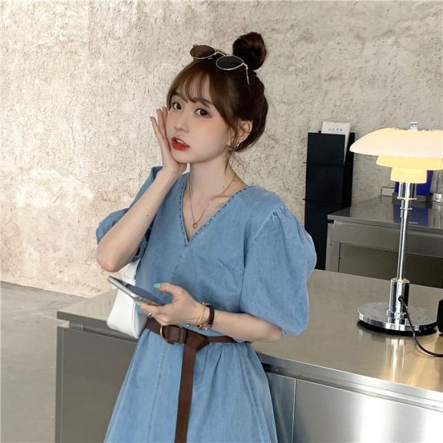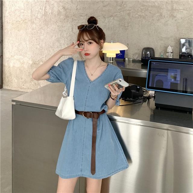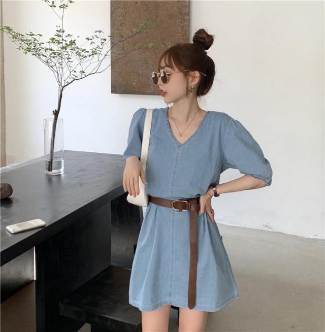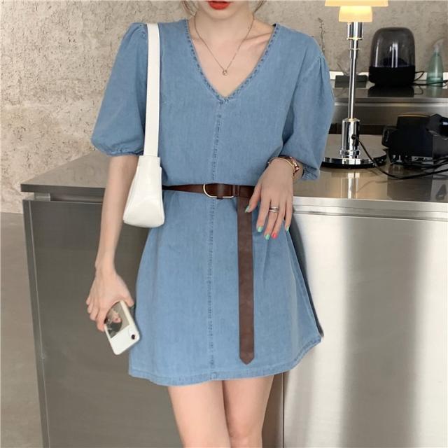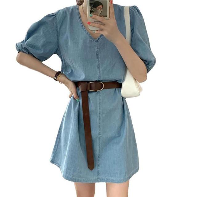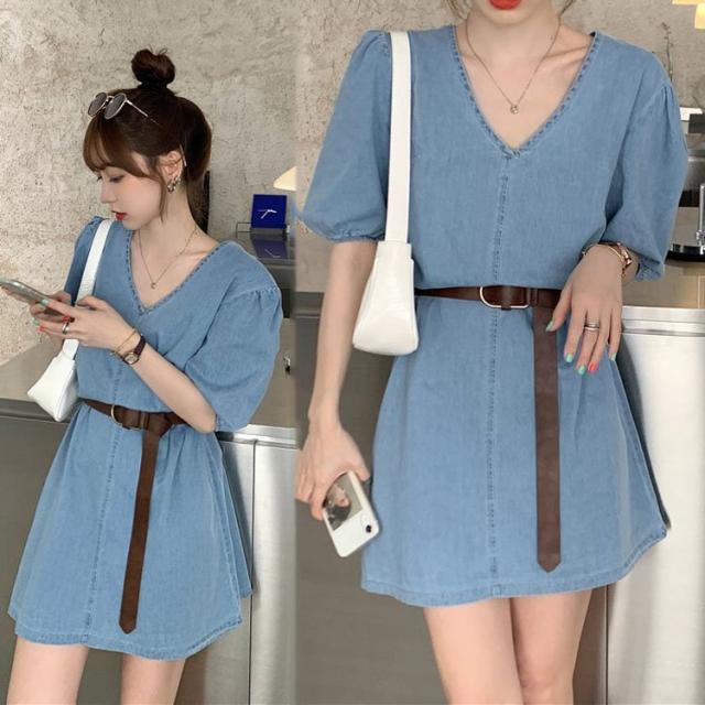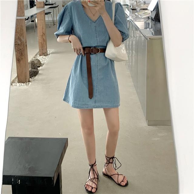 デニムワンピース レディース 40代 きれいめ ショート丈ワンピース 五分袖ワンピース vネック Aラインワンピース ベルト付き 韓国風 オシャレ 着痩せ