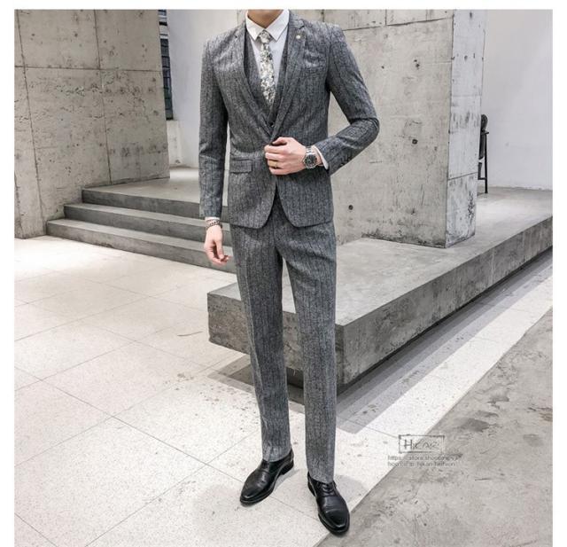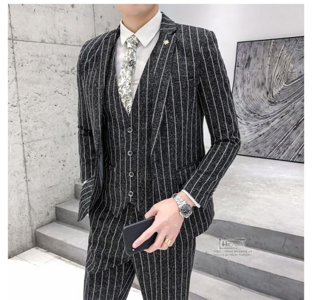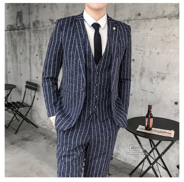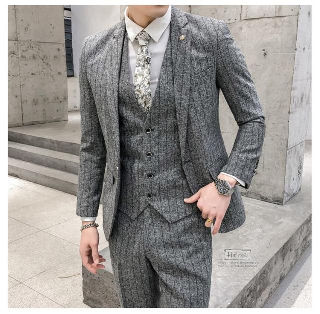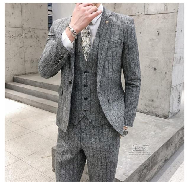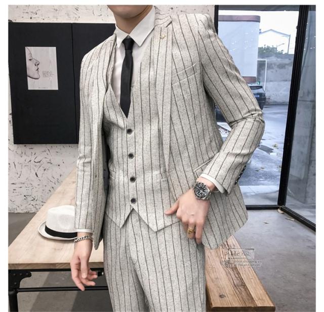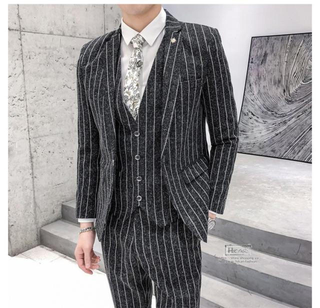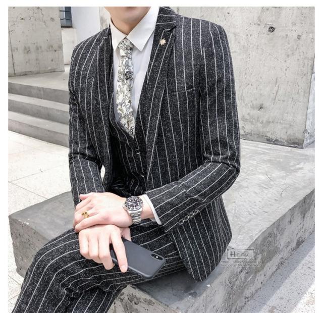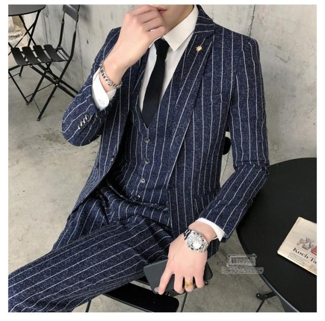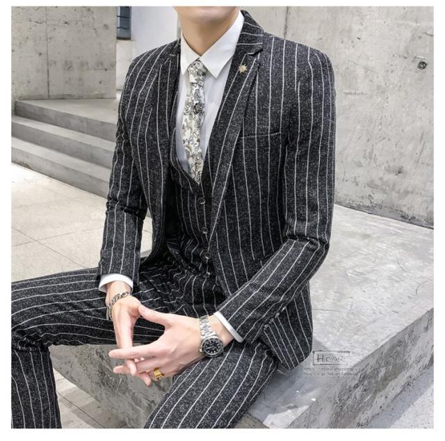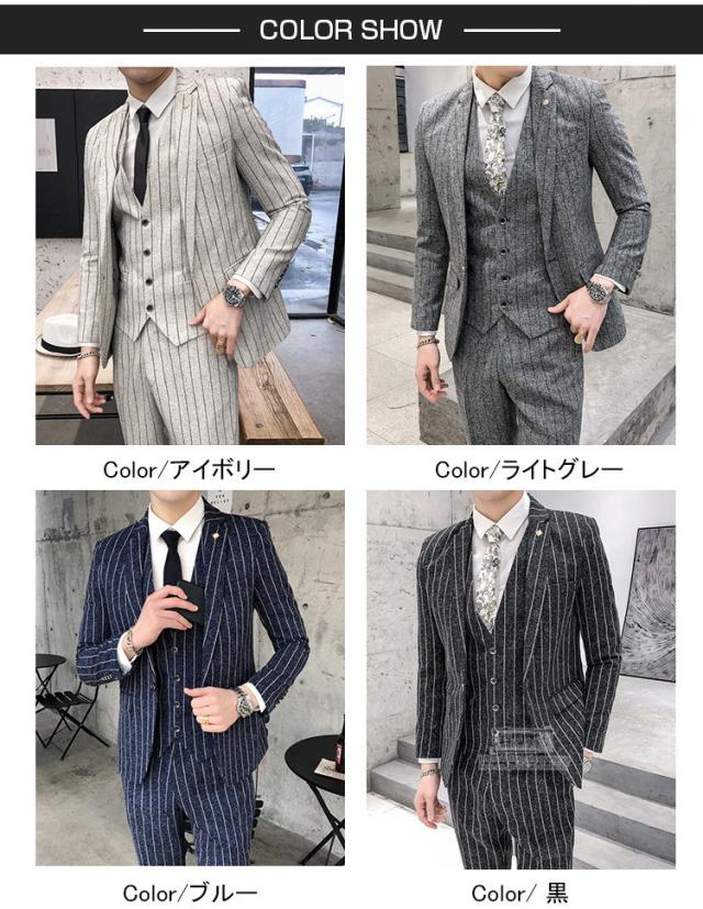 スーツ メンズ ストライプ スリーピーススーツ カジュアルスーツ ビジネススーツ スタイリッシュ スリム 3点セット