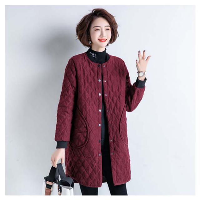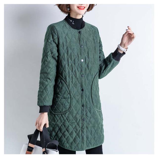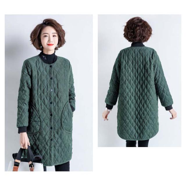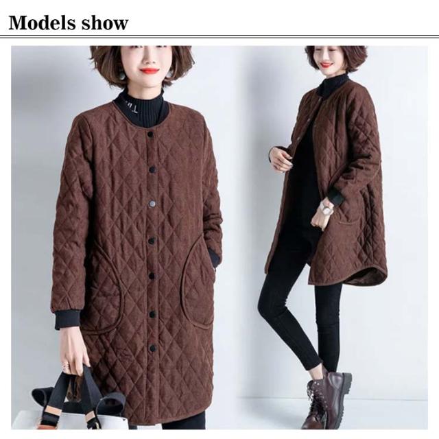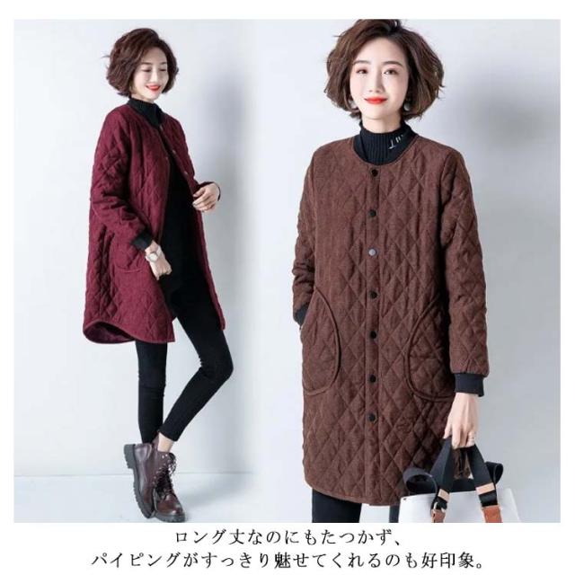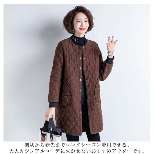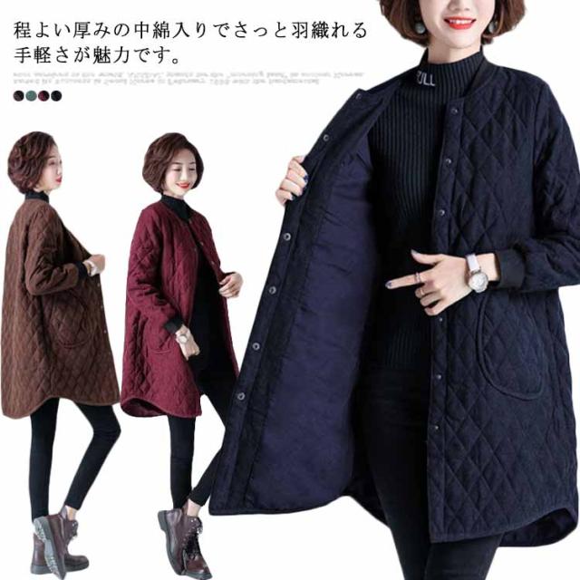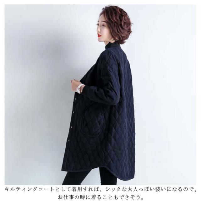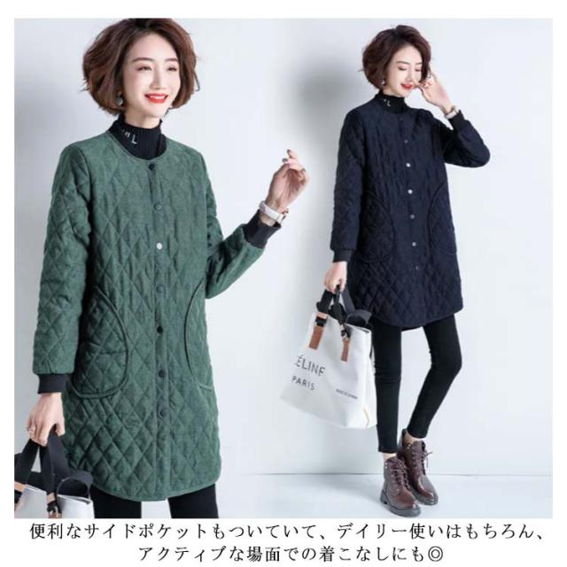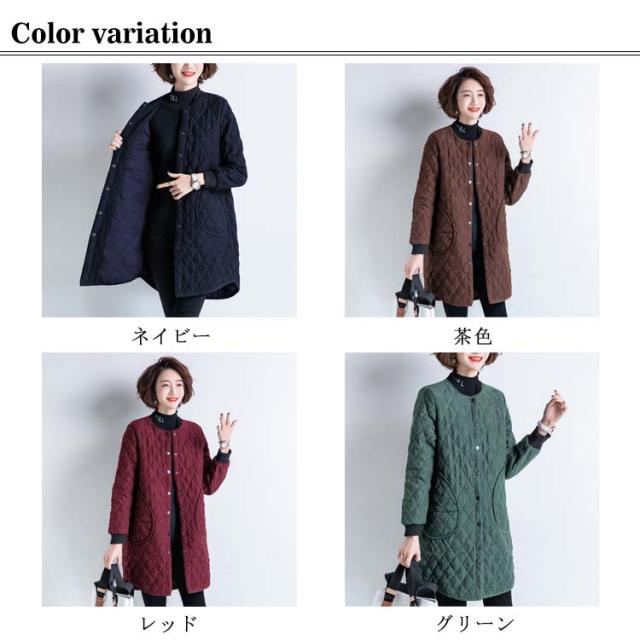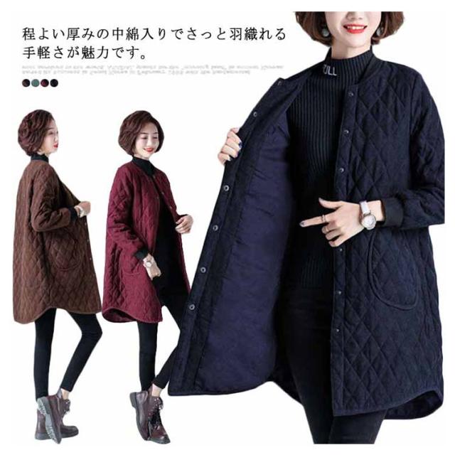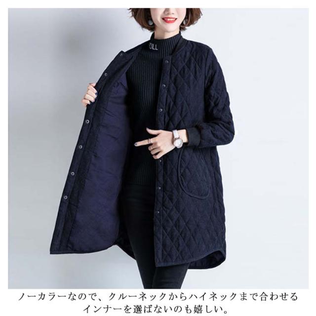キルティング ノーカラー コート ロング コーディガン 綿入り 中綿 秋冬春 M-4L 暖かい ジャケット レディース スリム 軽量 アウター 羽織り きれいめ 防寒 保温 カジュアル 20代 30代 40代 50代 60代 ネイビー 紺 大きいサイズ M-4L