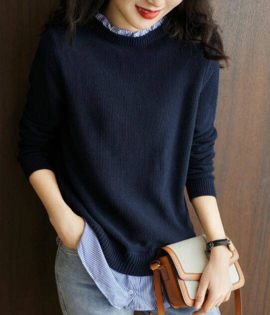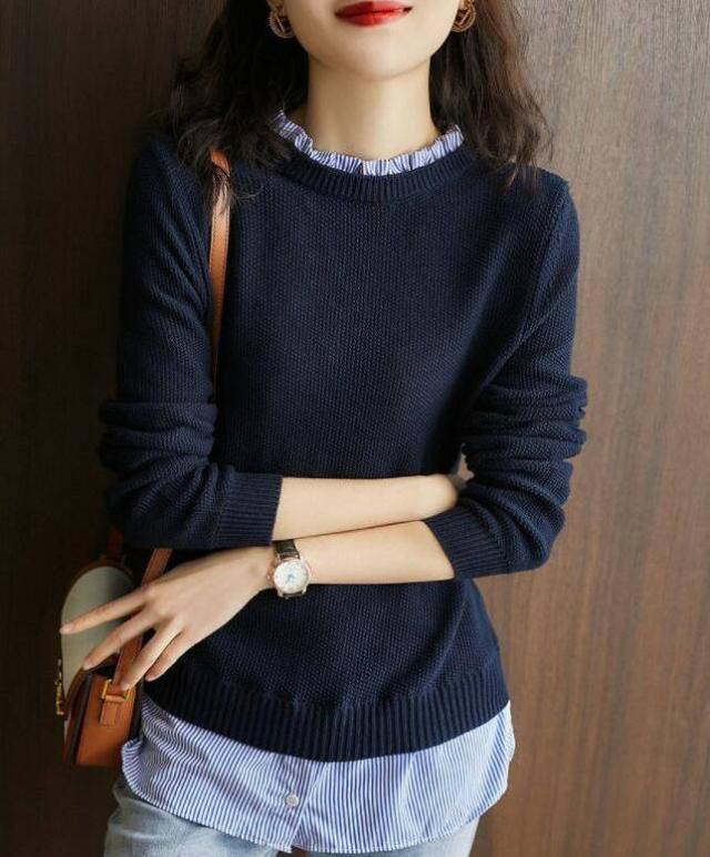 プリーツ ニット トップス レディース きれいめ セーター 秋冬 トップス 襟元プリーツ 長袖 ブラウス裾 レイヤード風 重ね着風 長袖ニットプルオーバー 細身 大人 上品 ネイビー