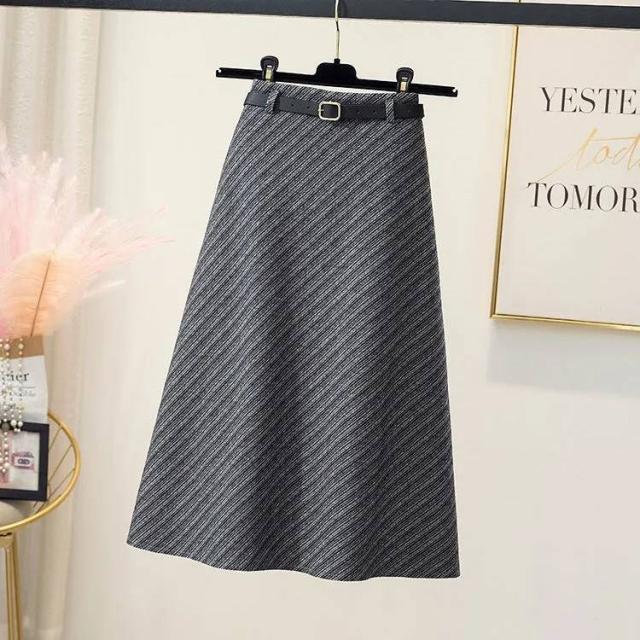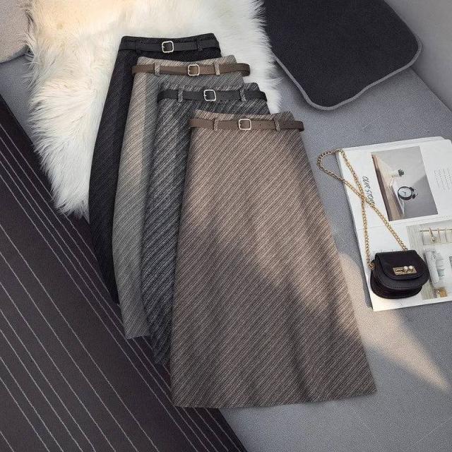 スカート ロングスカート 秋冬 レディース ミモレスカート ストライプ Aライン シンプル おしゃれ エレガント ラシャ ベルト付き S M L XL 斜めストライプ