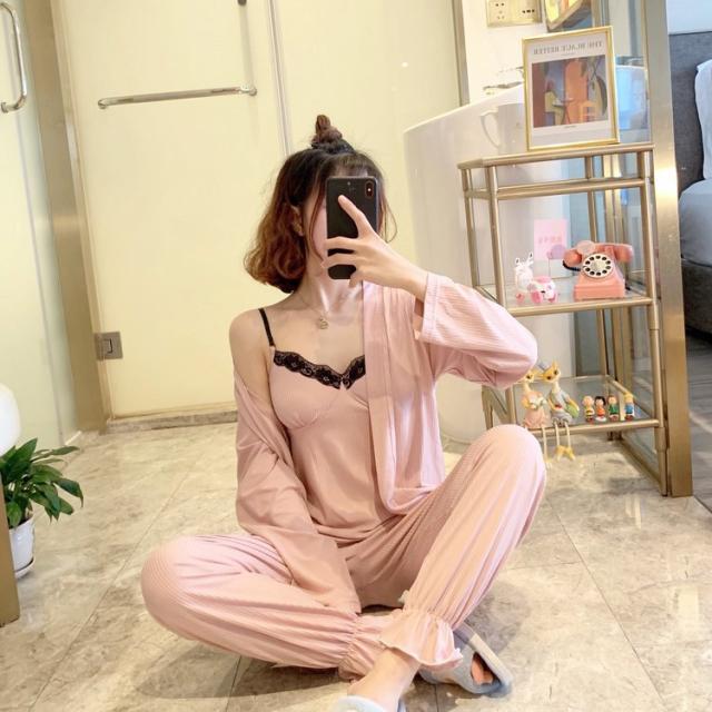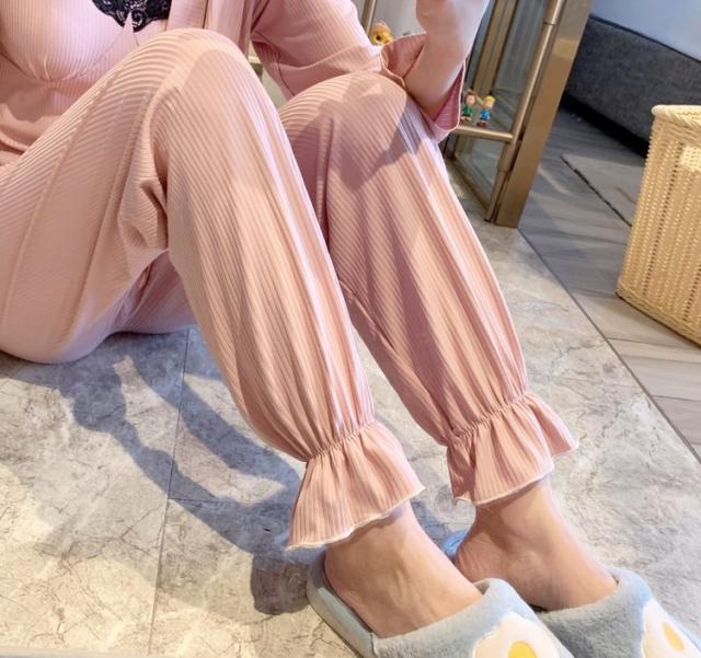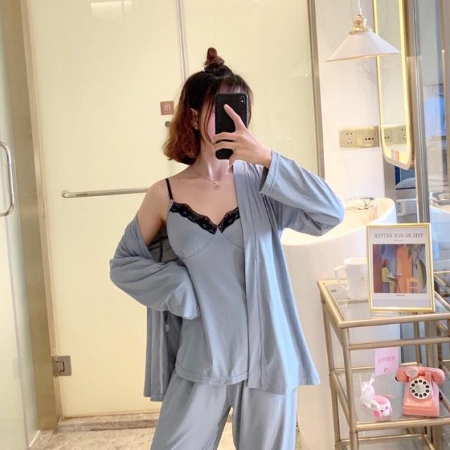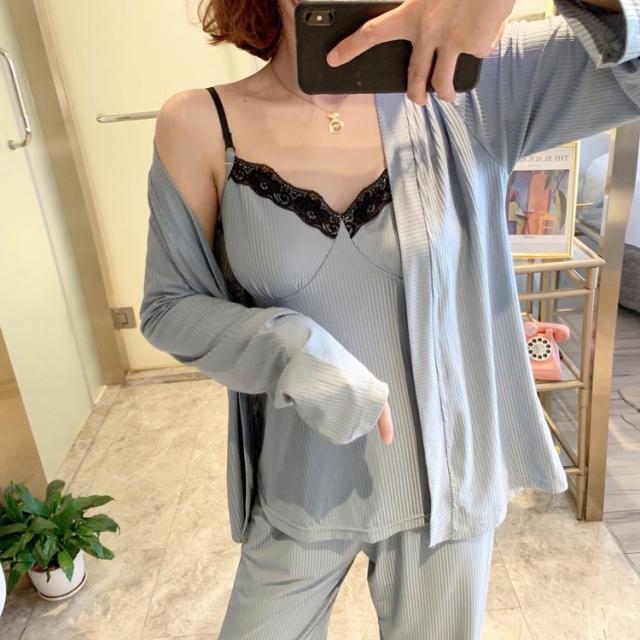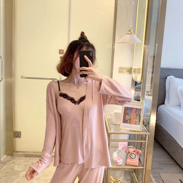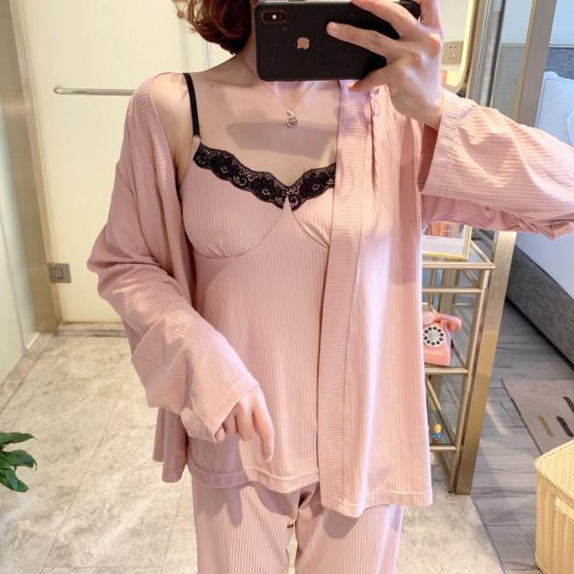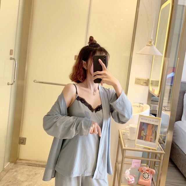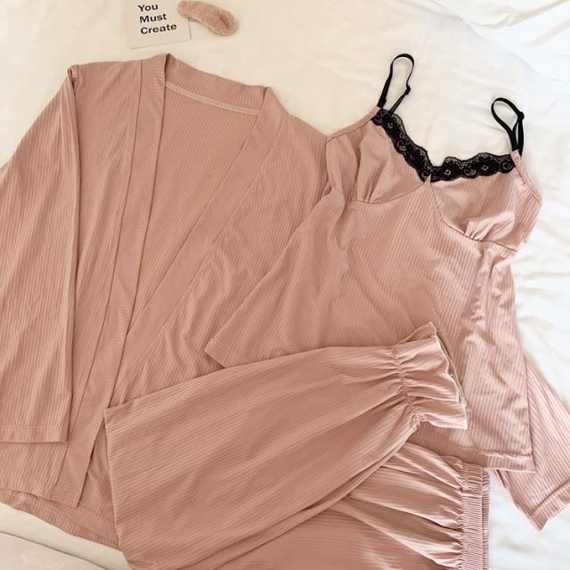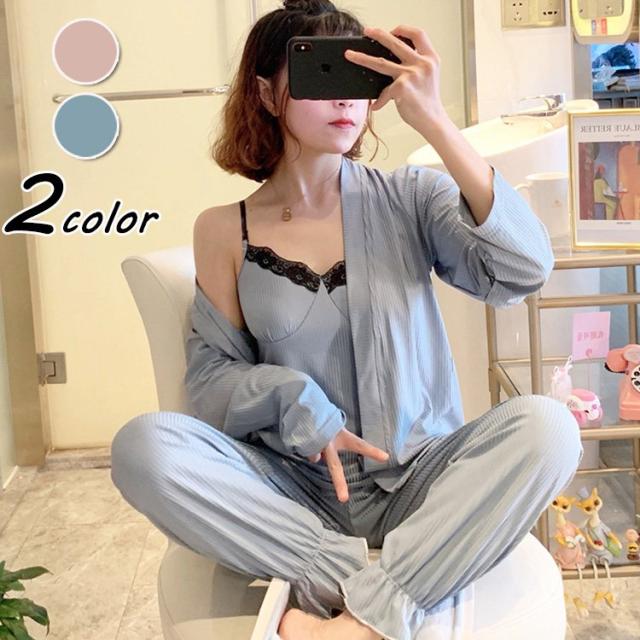 3点パジャマ ルームウェア レディース 春夏秋 前開きパジャマ 長袖 ロングズボン レースVネック 可愛いルームウェア 薄手レション 部屋着 ランジェリー