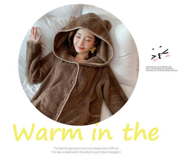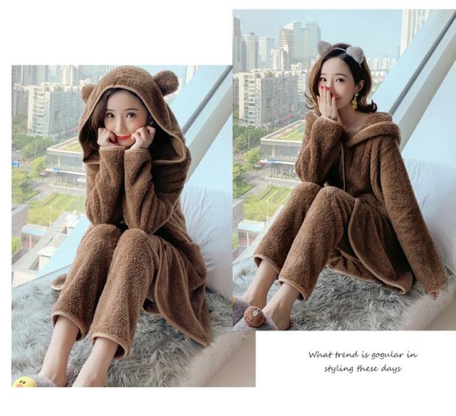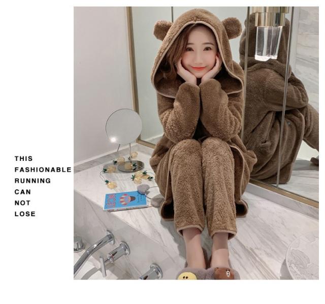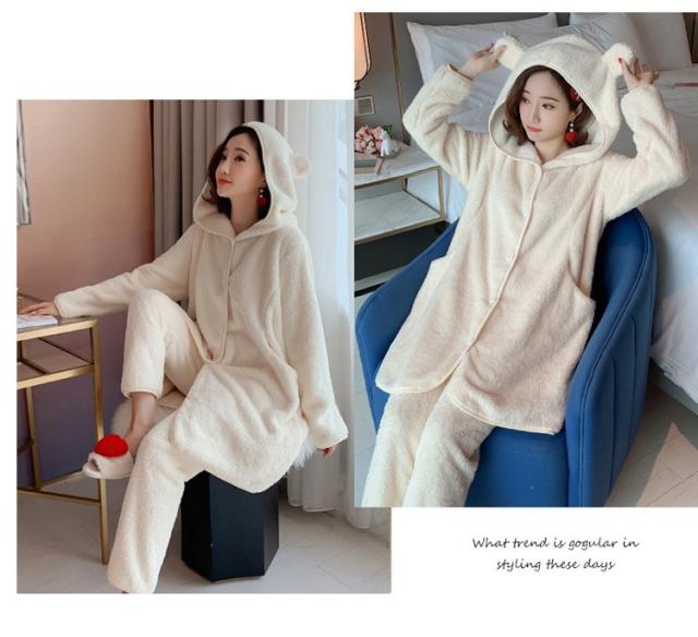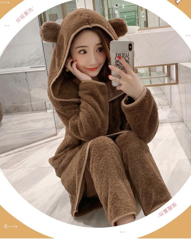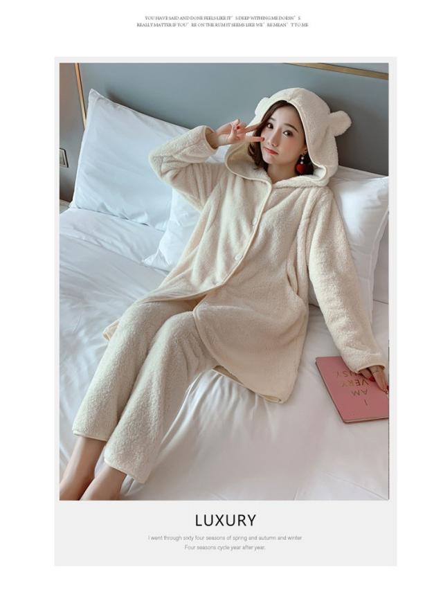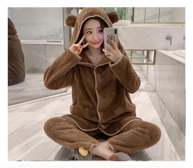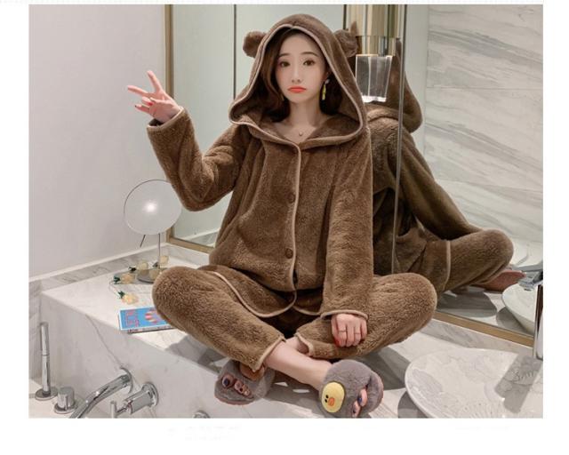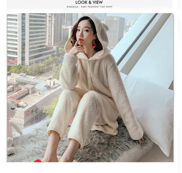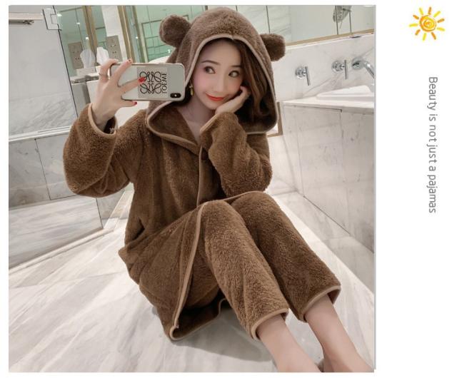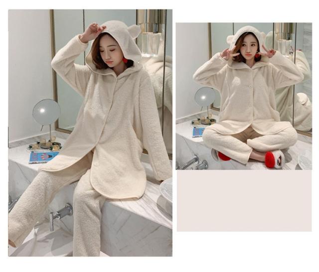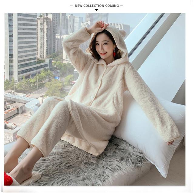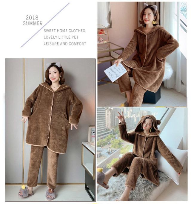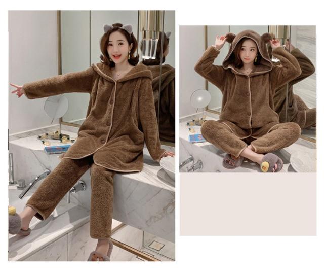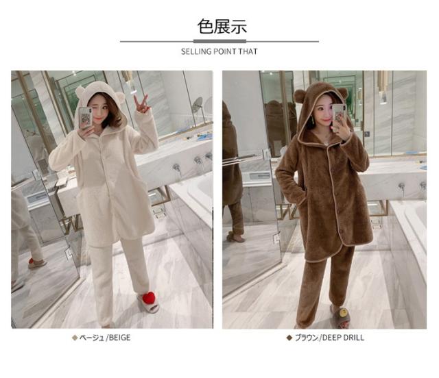 パジャマ ルームウェア レディース 秋冬 モコモコ 長袖パジャマ フランネル ルームウェア 熊フード付き 暖かい 上下セット 可愛い 厚手女性 部屋着 2色