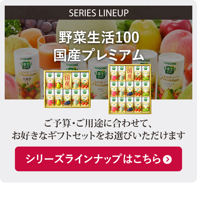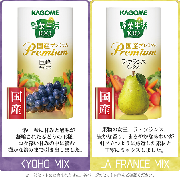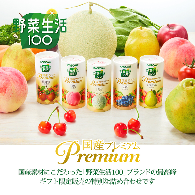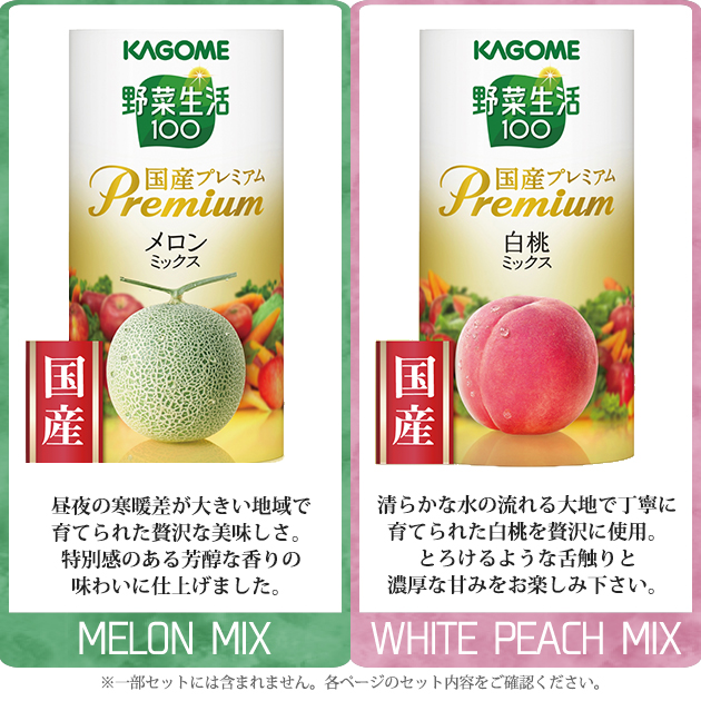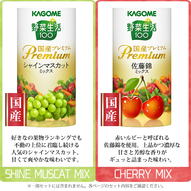 ●野菜生活100国産プレミアム(白桃ミックス・シャインマスカットミックス・メロンミックス・佐藤錦ミックス)各125ml(紙製容器)×各3・野菜生活100国産プレミアム巨峰ミックス125ml(紙製容器)×2(※国産:飲料に含まれている野菜・果物)