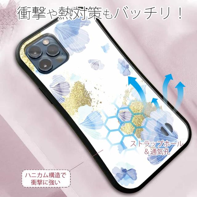 | 素 材 | 側面はゴムのように柔らかいTPU素材で、背面は衝撃に強いアクリル樹脂で、スマホ本体を守ります。ケースの内側はハニカム構造!スマホ本体の熱を逃がすばかりか、衝撃にも強い構造となっています。万が一の落下でもケースが割れることがないばかりか、TPUはシリコンとは異なり伸びることもなく、スマホの脱着が容易なケースとなります。 |