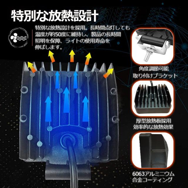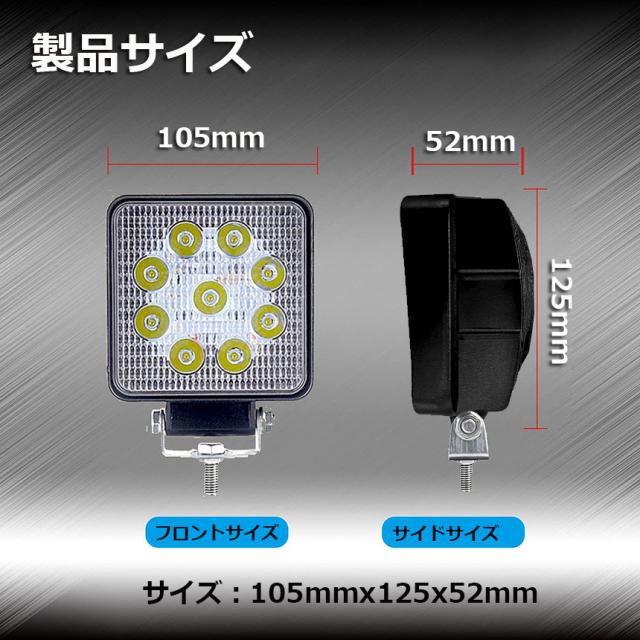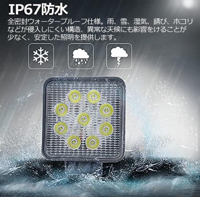 【製品仕様】:10.5(L)x10.5(W)x5.2(H)CM。 LED電力:27W (3W型高輝度LEDx9個)。 色温度:6000K、ホワイト発光。 全光束:1700LM。【性能】:IP67レベル全密封ウォータープルーフ仕様。雨、雪、湿気、錆び、ホコリなどが侵入しにくい構造、異常な天候にも影響をけることが少なく、安定した照明を提供します。