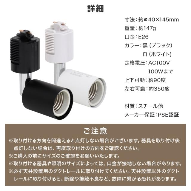 | 注意事項 | ・取り付ける方向を間違えると点灯しない場合がございます。 器具を取り付け後、点灯しない場合は、再度取り付けの方向をご確認ください。 ・ご購入の前にサイズのご確認をお願いいたします。 ・取り付ける器具や照明のサイズによっては、口金が接地しない場合があります。 ・必ず天井設置用のダクトレールに取り付けてください。 天井設置以外のダクトレールに取り付けると、断線や接触不良など、故障に繋がる恐れがあります。 ・商品は、モニターによって色合いが異なって見える場合があります。 ・仕様・デザインは改良のため予告なく変更することがあります。 |