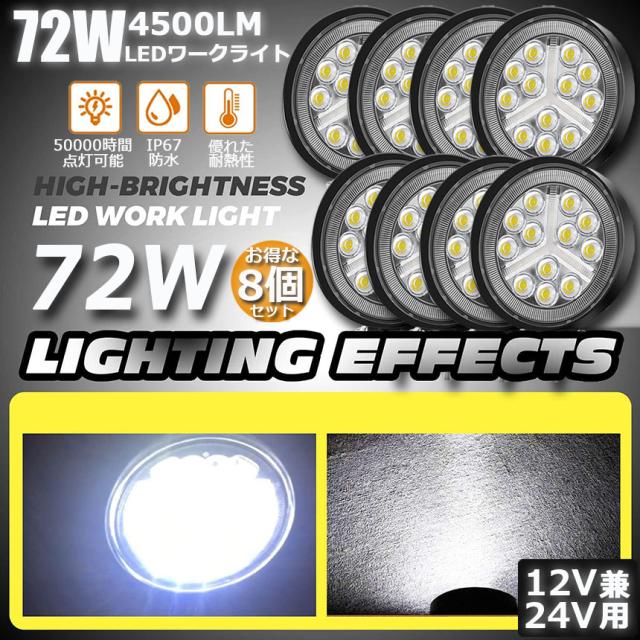 72W LED作業灯 ワークライト 8点セット デッキライト LED投光器 72w 12v 24v 兼用 防水 防塵 防震 取付け自由 省エネルギー 前照灯 コンボビーム 集光 投光両立 各種作業車に対応