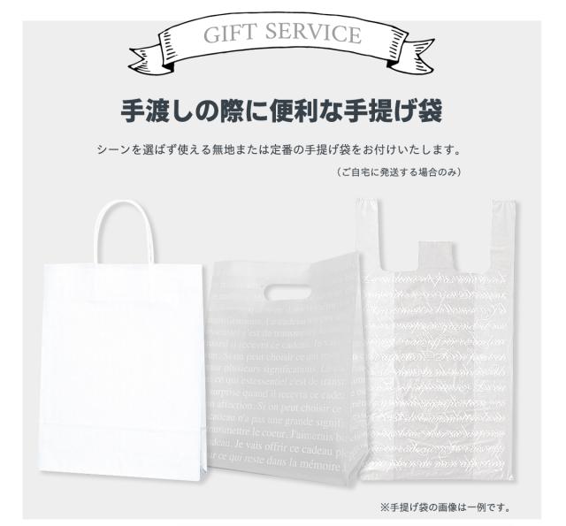 シーンを選ばず使える無地または定番の手提げ袋を無料でお付けいたします。(ご自宅に発送する場合のみ)