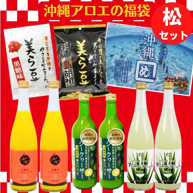 福袋 沖縄アロエの福袋(松) 送料無料 沖縄県産ジュース贅沢セット(アロエベラジュース・シークヮーサー果汁・タンカンジュース・沖縄めんべい・美ら豆黒糖味・美ら豆島胡椒味)2026年 2025年 沖縄福袋 ジュースセット 詰め合わせ ドリンクセット 沖縄県産 土産 お菓子