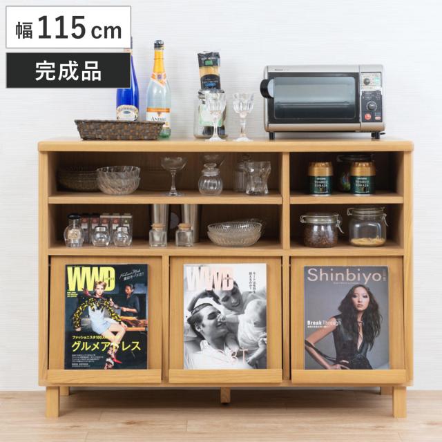 シェルフ 幅115cm フラップ扉 天然木 タモ材 ( マガジンシェルフ リビングチェスト 食器棚 キッチンカウンター 完成品 収納 収納棚 リビング収納 木目 ブラウン ナチュラル 木製 北欧 おしゃれ )