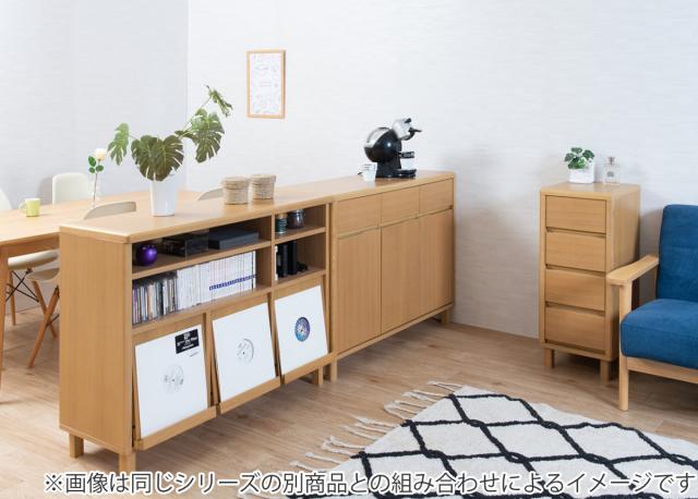 | 材質 | 天板縁、側板全面、脚部:天然木タモ材(ウレタン樹脂塗装) 前板、側板:天然木タモ化粧板(ウレタン樹脂塗装) 本体背面、内張り、棚板:プリント紙化粧繊維板 |