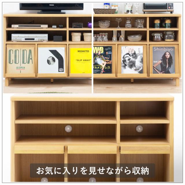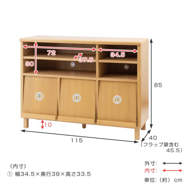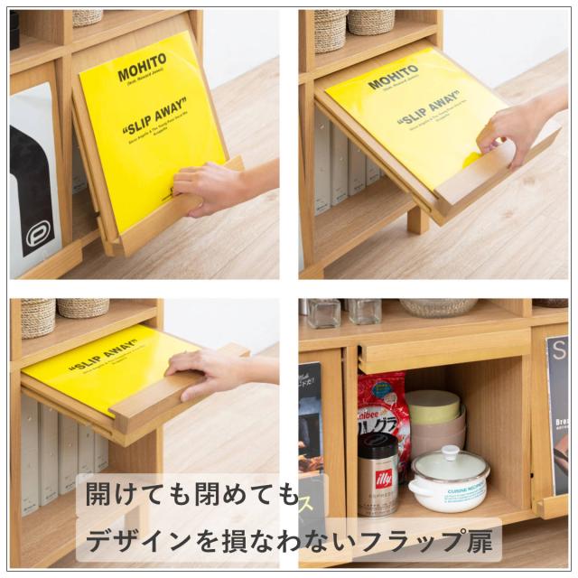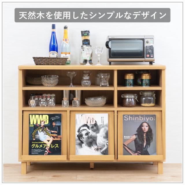 シェルフ 幅115cm フラップ扉 天然木 タモ材 ( マガジンシェルフ リビングチェスト 食器棚 キッチンカウンター 完成品 収納 収納棚 リビング収納 木目 ブラウン ナチュラル 木製 北欧 おしゃれ )