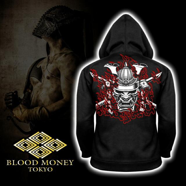 パーカー メンズファッション BLOOD MONEY TOKYO MBT-21010 和柄 侍 鎧武者 黒×白 赤 オラオラ系 ヤンキー ジャケット 上着 服 ヤクザ ブランド 胸刺繍 フード付き 長袖 ライダース バイク乗り ギャング チカーノ B系 HIPHOP系 バイカー 悪党の店 バースジャパン BIRTHJAPAN