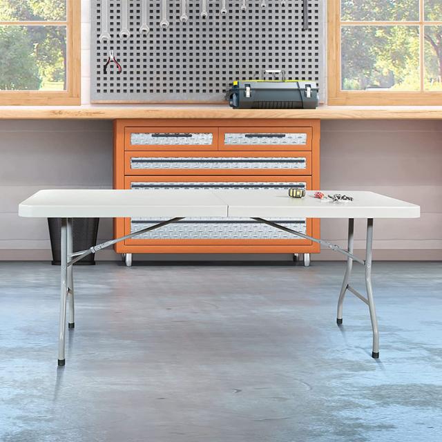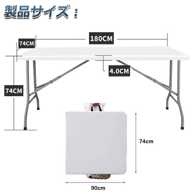 【折りたたみ式デザイン】:使用しないときは持ち運びや保管が簡単で、組み立ても不要で、テーブルを数秒で開いて折りたたむことができます。【収納が簡単】:全体のサイズはL 180cm * W 74cm * H 74cm(約)、大人8〜10人で十分なスペース、折り畳み寸法はL 90cm * W 74cm * H 8cm(約)、 スペースをほとんどとらず、保管も非常に簡単です。