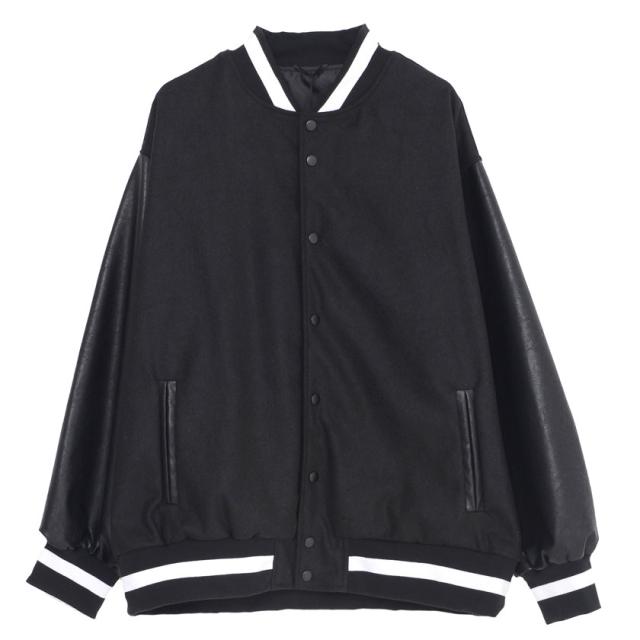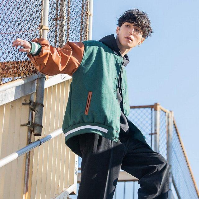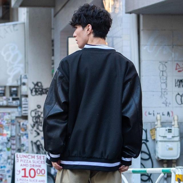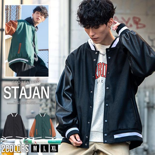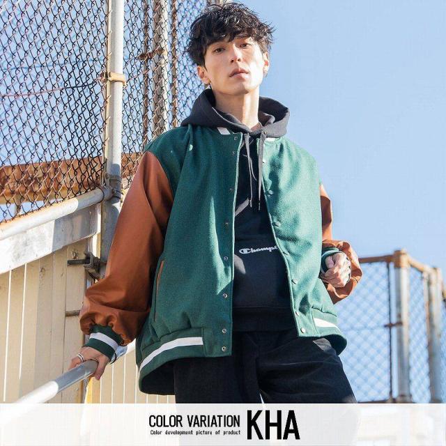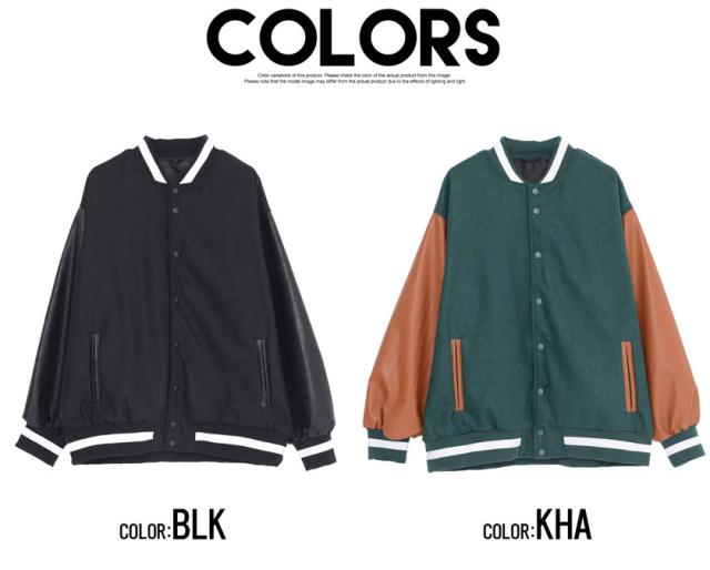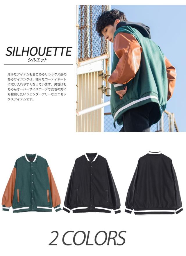スタジャン メンズ スタジアムジャケット ブルゾン エコレザー 切り替え PUレザー 無地 シンプル 大人 カーキ ブラック 黒 M L XL ユニセックス カジュアル ストリート系 韓国ファッション 秋 冬 冬服 冬物 CavariA 即日発送 [CANG21-66]