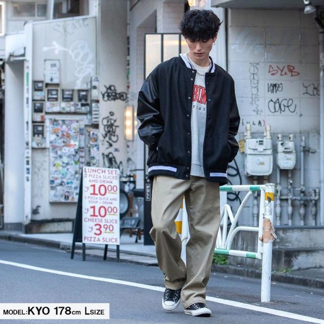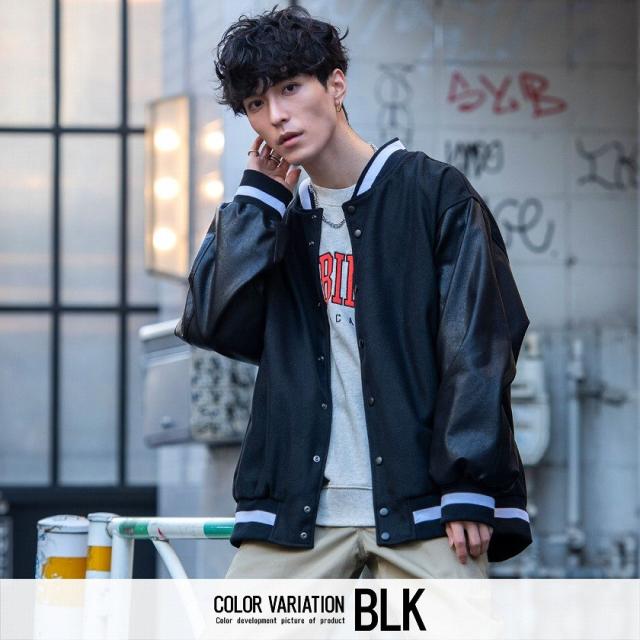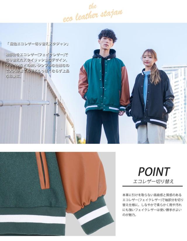 スタジャン メンズ スタジアムジャケット ブルゾン エコレザー 切り替え PUレザー 無地 シンプル 大人 カーキ ブラック 黒 ユニセックス M L XL カジュアル ストリート系 韓国ファッション 秋服 冬服 秋 冬 冬服 冬物 CavariA キャバリア配送について