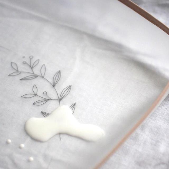 Lien de famille(リヤンドファミーユ )らしい可愛すぎない落ち着いたシックな色味で縁取り、中央にカトラリーと若葉をあしらったナチュラルなデザインです。マットの中央にお皿を置くとリースにかこまれているような華やかな食卓を演出できます。
