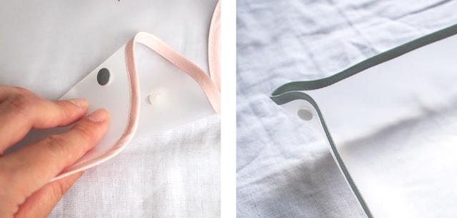 マットとエプロンはいずれも特許取得済の特殊形状になっています。スナップボタンで立体に形作る事ができるので液体をこぼしてしまっても広からず後始末が簡単にできます。掴み食べの時期にはまわりも汚れてしまう事が気になりがちですが、汚れが広がりにくいので、思いっきりお食事を楽しめます。