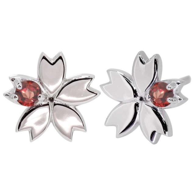 1月誕生石ガーネットを使用したシルバー製の、桜(フラワー)モチーフスタッドピアスです。