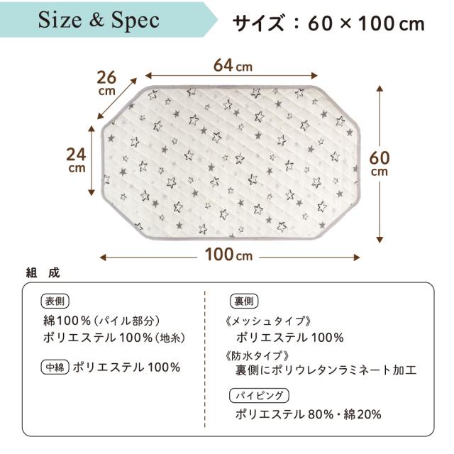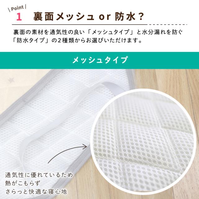 オーガニックコットンパイル地のコットカバーは、裏面を「通気性の良いメッシュタイプ」と「水分を漏らさない防水タイプ」の2種類からお選びいただけます。