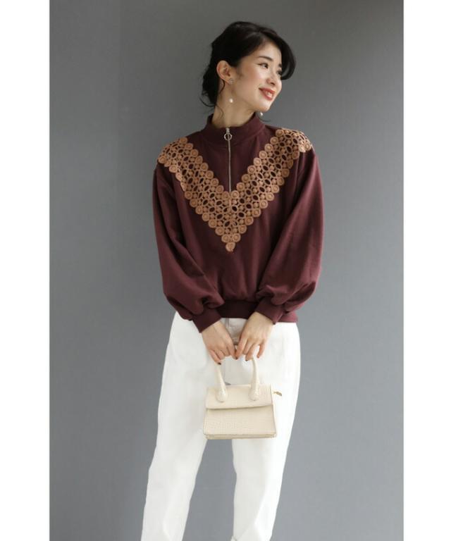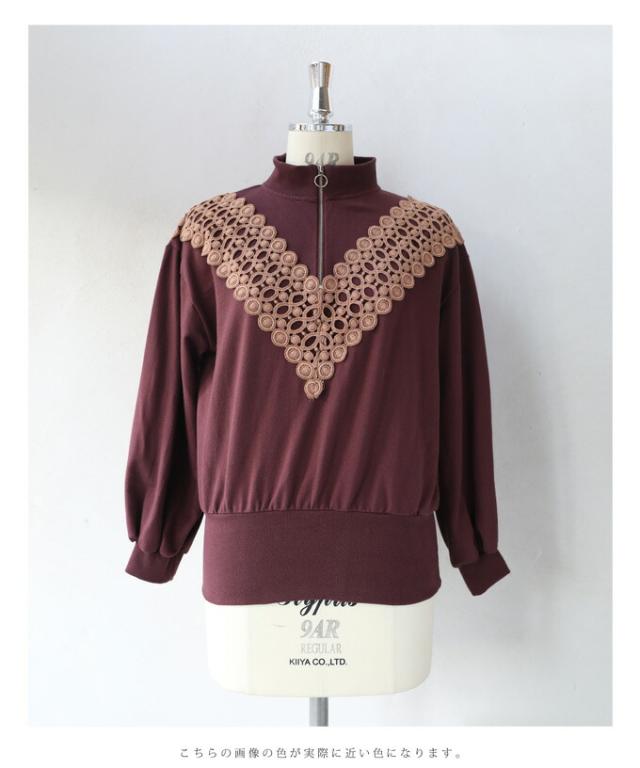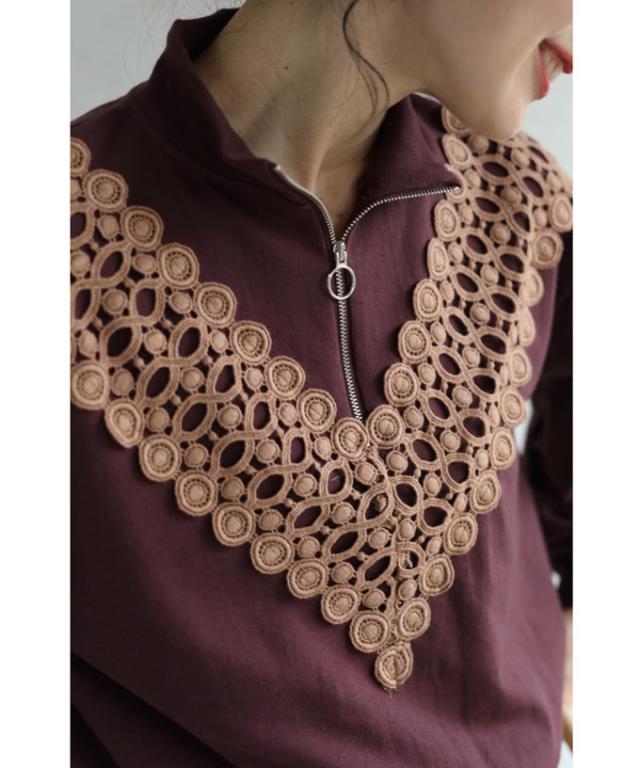 【閉店SALE】 ジップ プルオーバー トップス 長袖 wkg00106 (S~L対応)V型サークルレースが目を惹くジッププルオーバートップス cawaii ニット 長袖 タートルネック セーター ハイネック 柄 刺繍 プルオーバー お呼ばれ 通勤