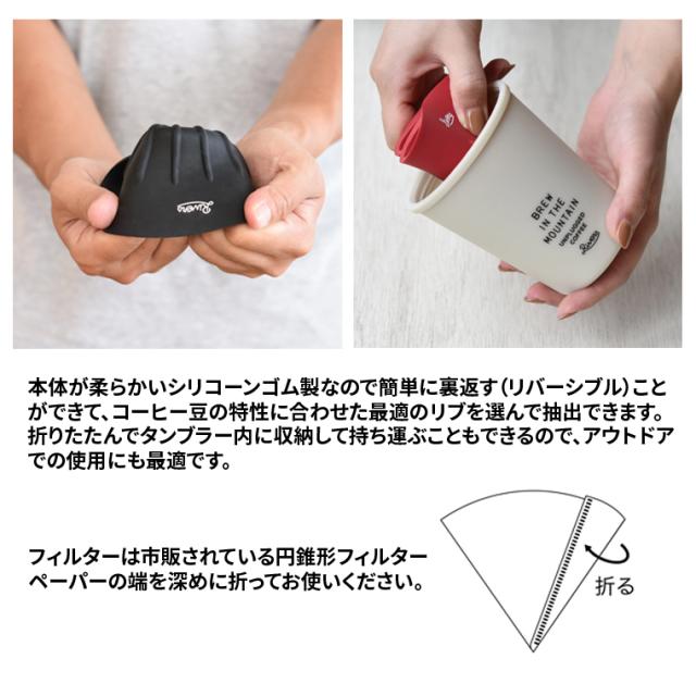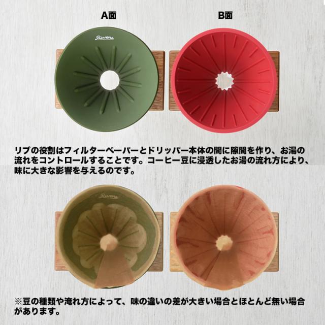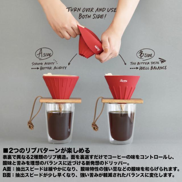 また、本体が柔らかいゴム製なので簡単に裏返す(リバーシブル)ことができて、さらにドリッパーの表裏に異なる2種類のリブが刻まれているので、コーヒー豆の特性に合わせた最適のリブを選んで抽出できることが最大の特長です。